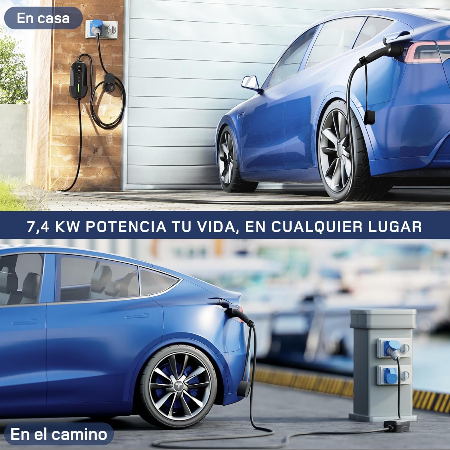 【Sin instalación】 Cargador de coche eléctrico de 7,4kW, no requiere instalación, solo necesitas un enchufe CEE, más sencillo y económico. Ligero y portátil, utilice un cargador de pared móvil en casa o mientras viaja.