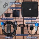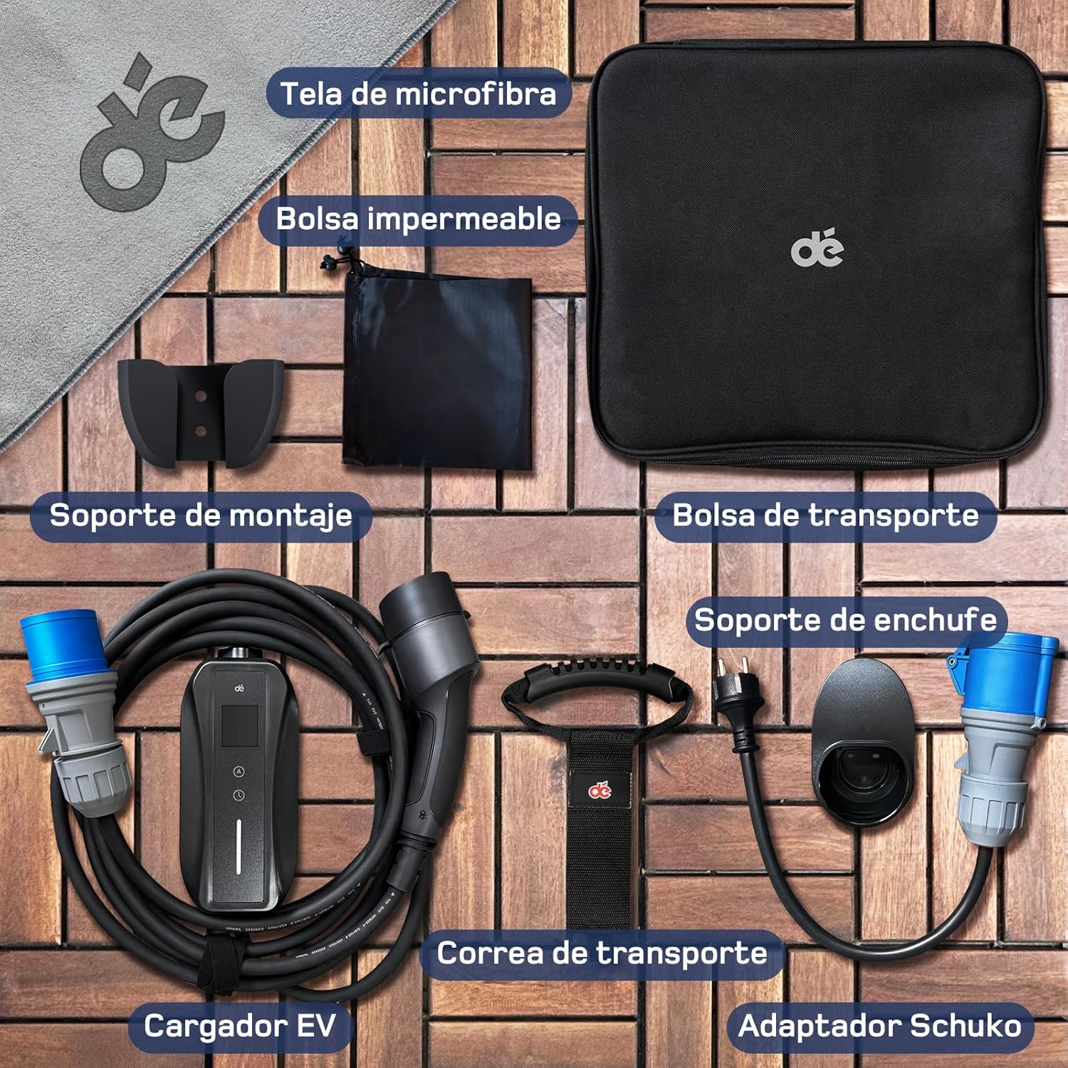 【Paquete todo en uno】Nuestro paquete incluye un cargador EV tipo 2 “dé” (7,4 kW), junto con una bolsa impermeable, bolsa de transporte, correa, paño de microfibra, adaptador schuko y soporte para enchufe. La bolsa plegable cabe perfectamente en el maletero sin ocupar mucho espacio y la correa de transporte añade comodidad para transportarla o colgarla en la pared. Además, el paño de microfibra facilita la limpieza.