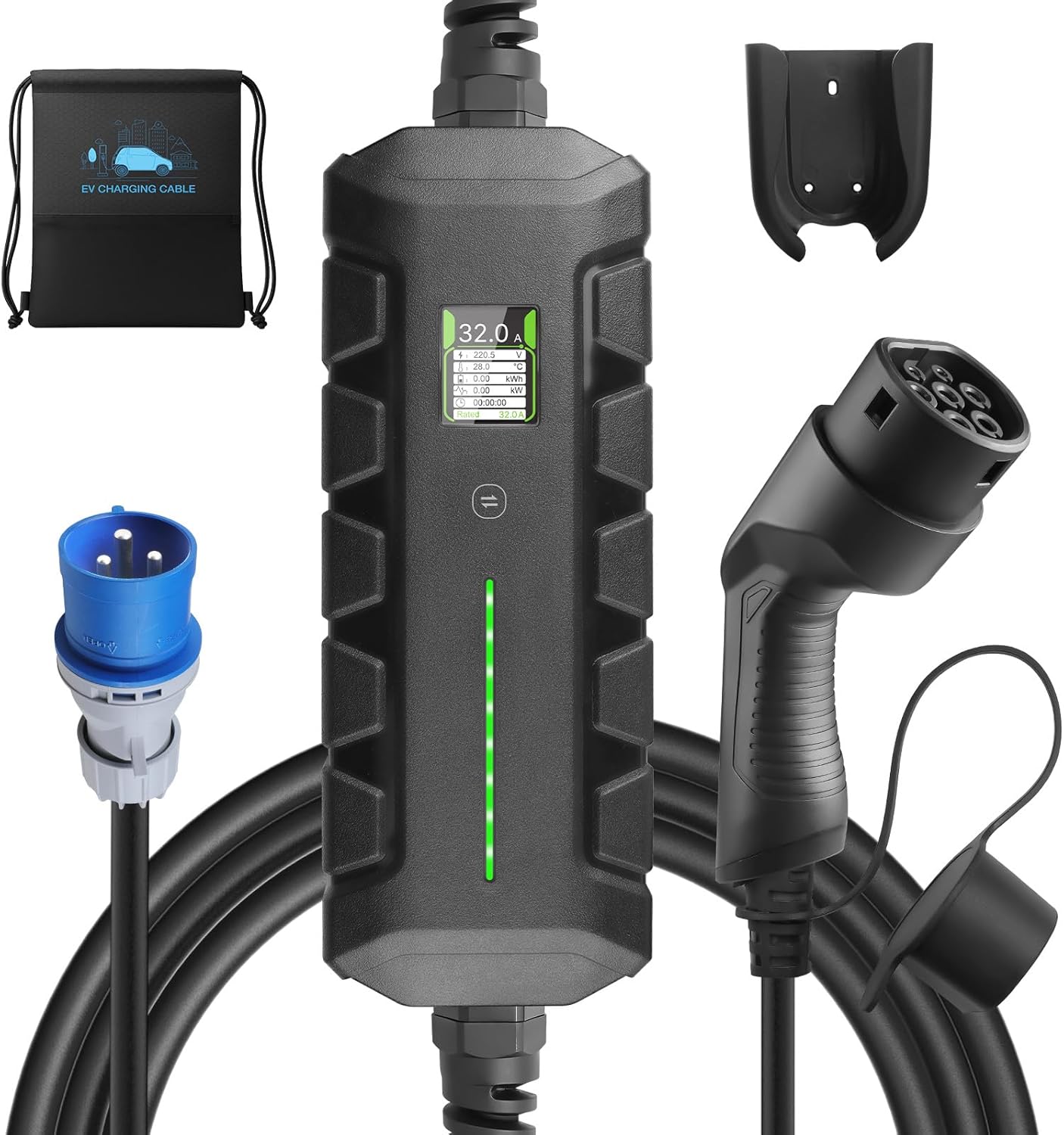 Hexinex Cargador portátil para vehículos eléctricos tipo 2, 7 KW, corriente ajustable, 8 A a 32 A, estación de carga para vehículos eléctricos, compatible con control de aplicaciones con pantalla LED digital y bolsa