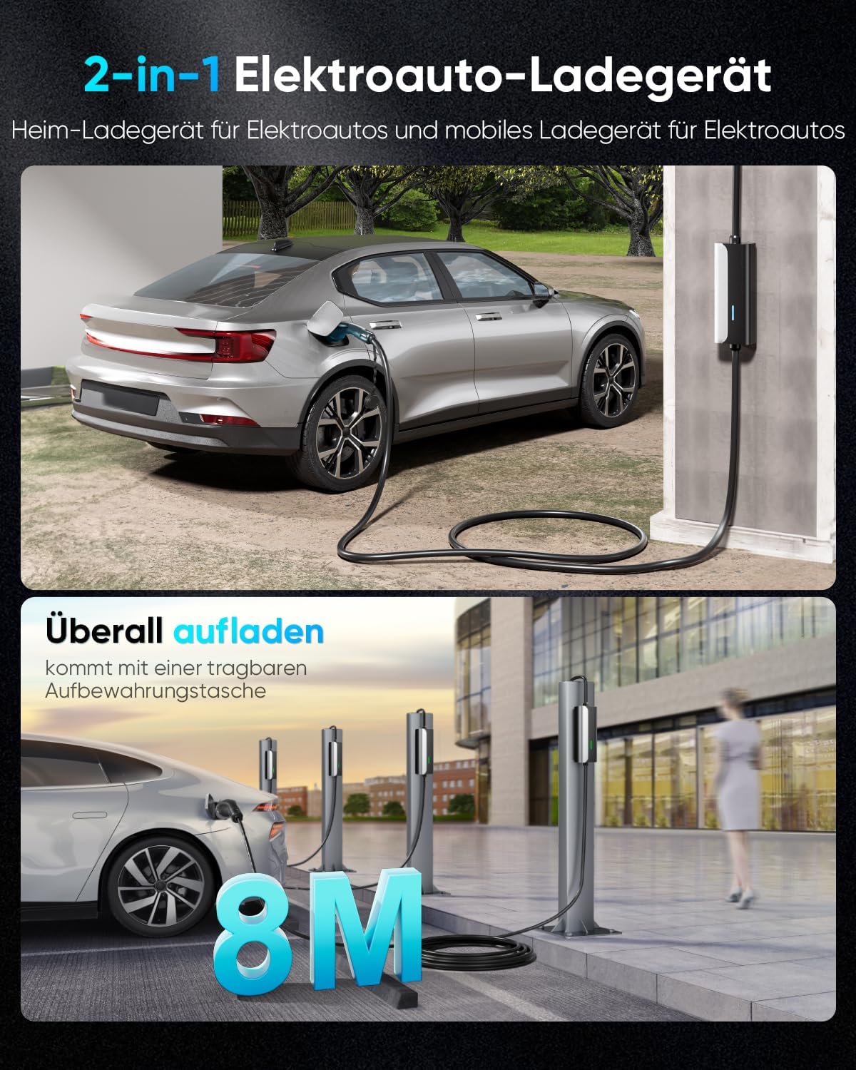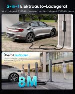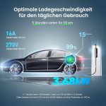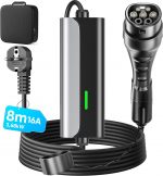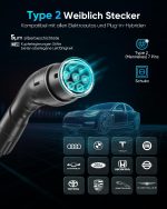 CARGA CÓMODA EN CUALQUIER LUGAR: puede cargar fácilmente su vehículo eléctrico en una toma Schuko. Conecte el enchufe Schuko a una toma de corriente doméstica y conecte el enchufe Tipo 2 al vehículo. Un indicador LED parpadeante muestra el estado de carga. Con un cable portátil de 8 m, podrás cargar en cualquier momento y lugar, ya sea en casa o mientras viajas, sin instalación adicional