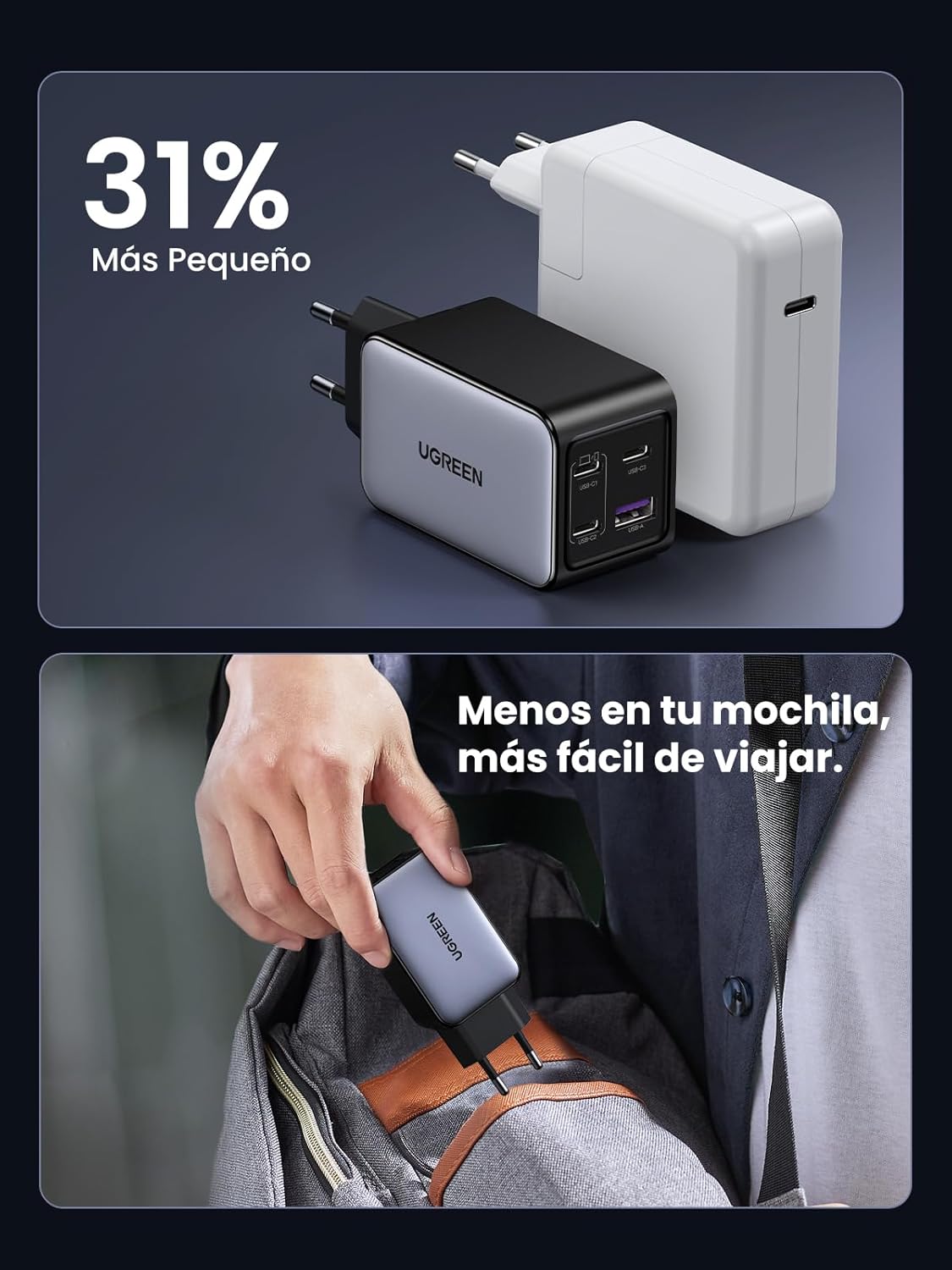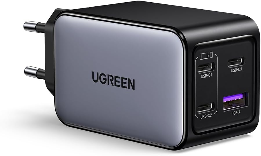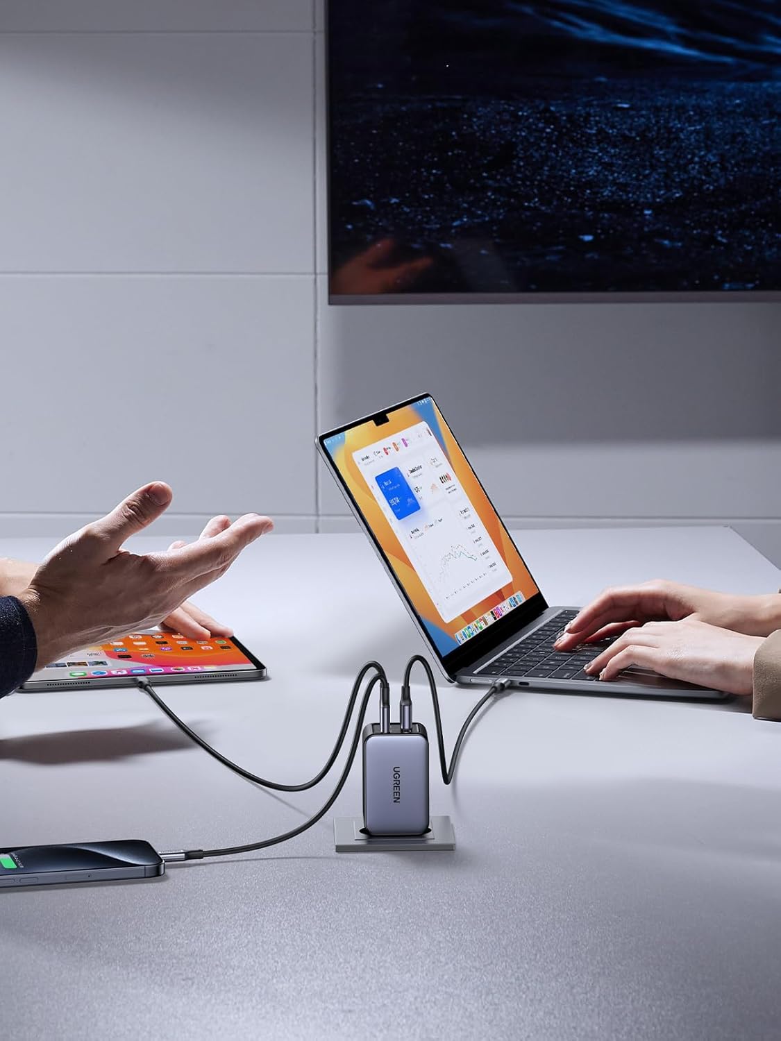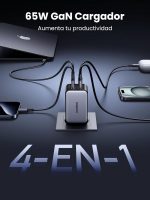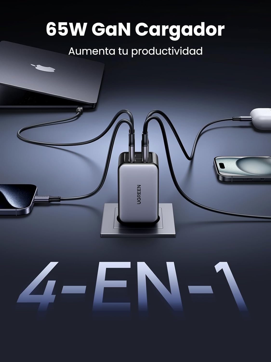 4 EN 1: el cargador UGREEN GaN de 65 W equipado con 3 USB-C y 1 USB-A puede cargar 4 dispositivos simultáneamente, desde computadoras portátiles hasta tabletas, teléfonos y accesorios. Aumente su productividad y diga adiós a los múltiples cargadores y a los cables enredados.