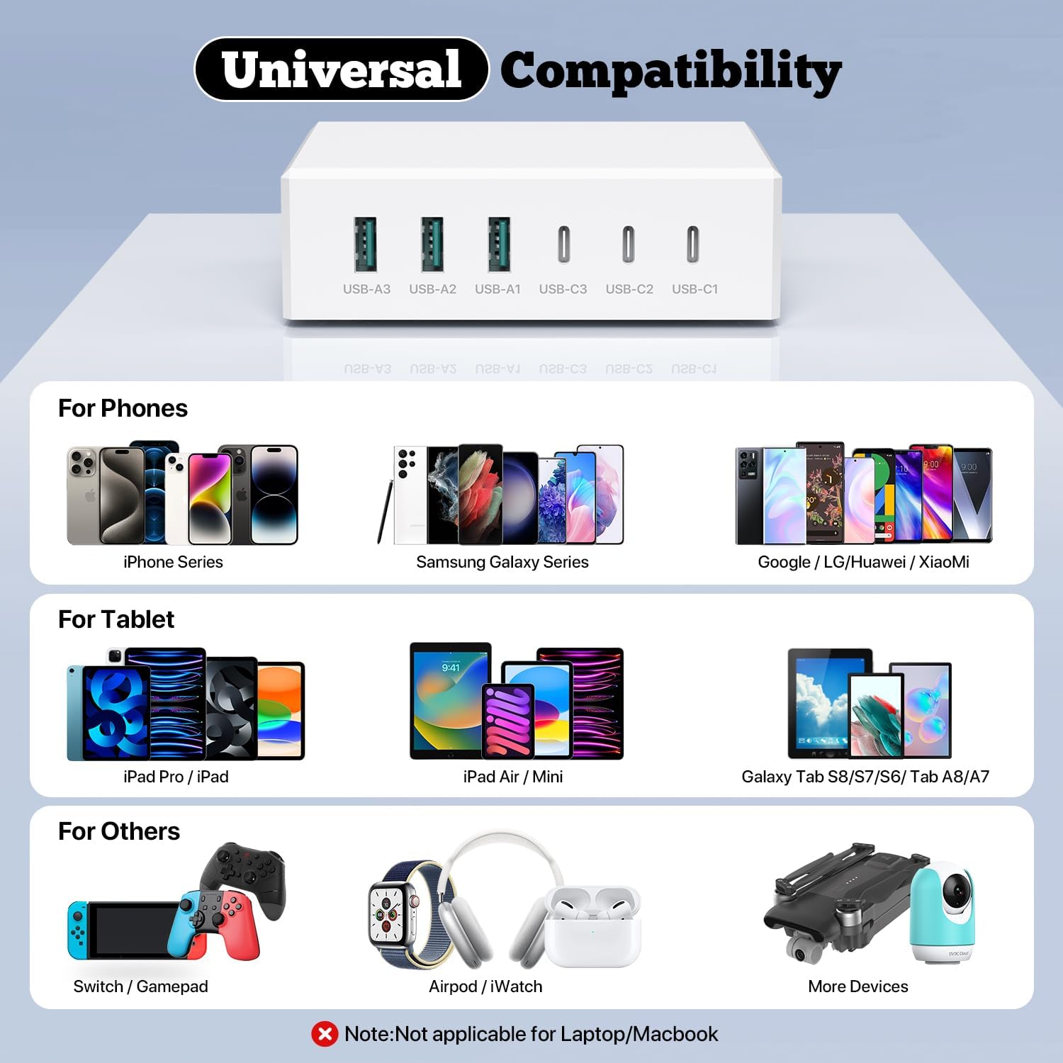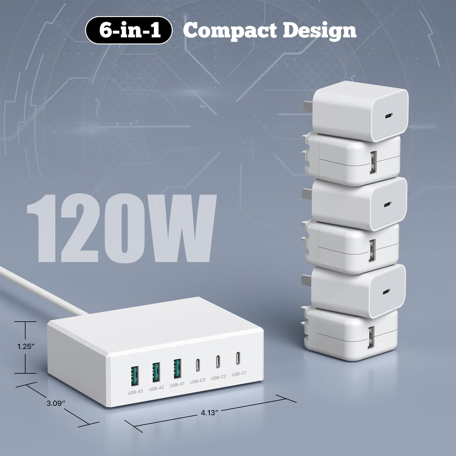 【Cargador de carga rápida USB C múltiple de 120 W mejorado】Esta estación de carga USB-C de escritorio USB C de 6 puertos de 120 W con 3 puertos USB-C y 3 puertos USB-A, esta estación de carga USB-C para varios dispositivos compatibles con iPhone, Samsung Galaxy, teléfonos inteligentes, tabletas, auriculares, etc., es capaz de suministrar energía para 6 dispositivos al mismo tiempo, mientras ahorra espacio y mantiene su escritorio ordenado, muy adecuado para el hogar, viajes, oficina, la escuela.