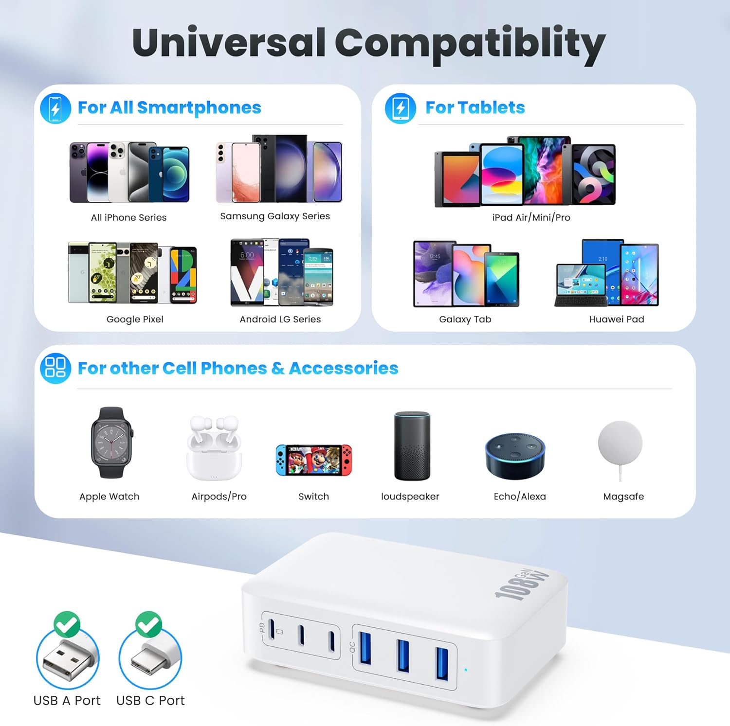 Cargador USB C múltiple de 108 W, cargador portátil USB C GAN III de 6 puertos, adaptador de teléfono de carga rápida PD 3.0+QC con 3 estaciones de carga tipo C y 3 USB-A para iPhone 16/15 Sumsung Airpod iPad Switch, etc.