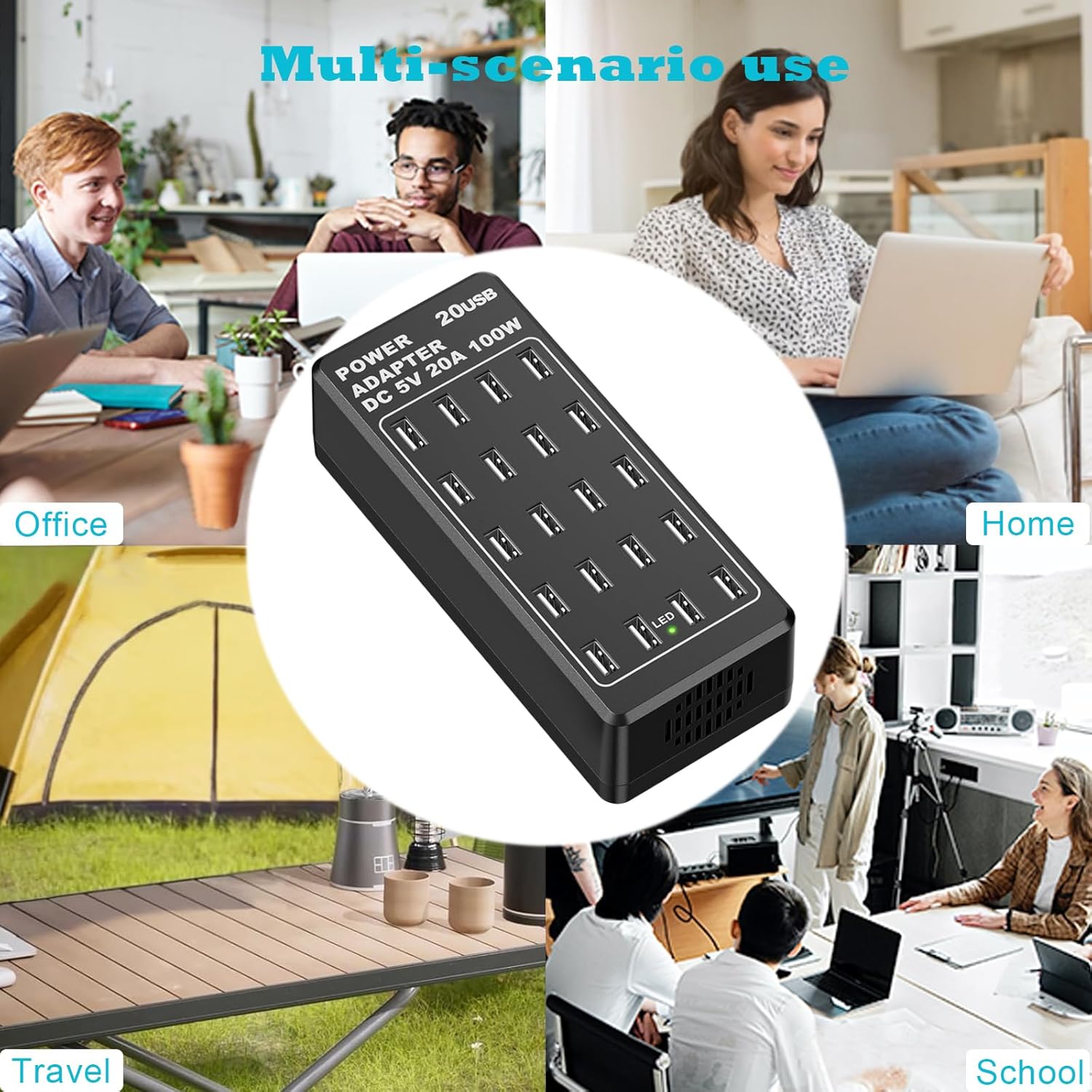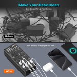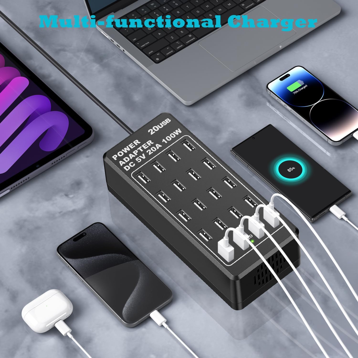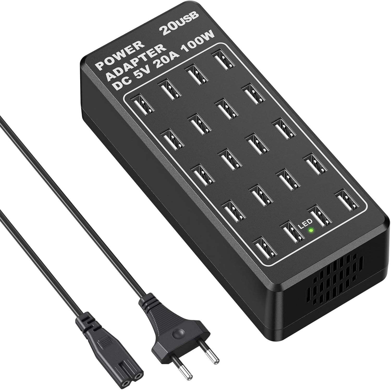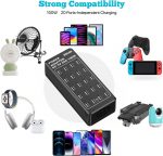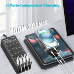 Cargador USB con 20 puertos: 20 puertos USB, todos los puertos se cargan simultáneamente con una potencia total de hasta 100 W, puede cargar hasta 20 dispositivos al mismo tiempo, resuelve eficazmente la necesidad de cargar varios dispositivos al mismo tiempo. Con una única estación de carga USB de escritorio con 20 puertos, puedes cargar fácilmente varios dispositivos sin necesidad de adaptadores adicionales.