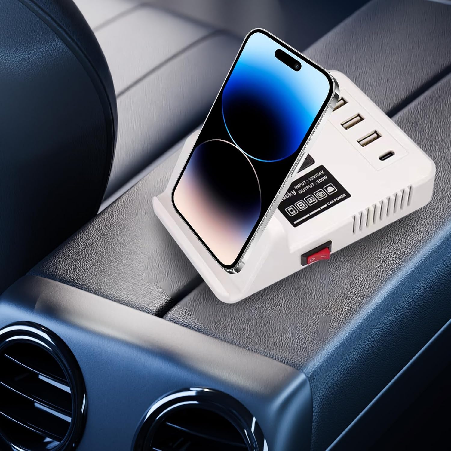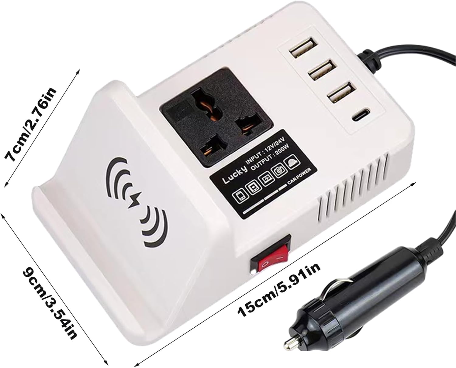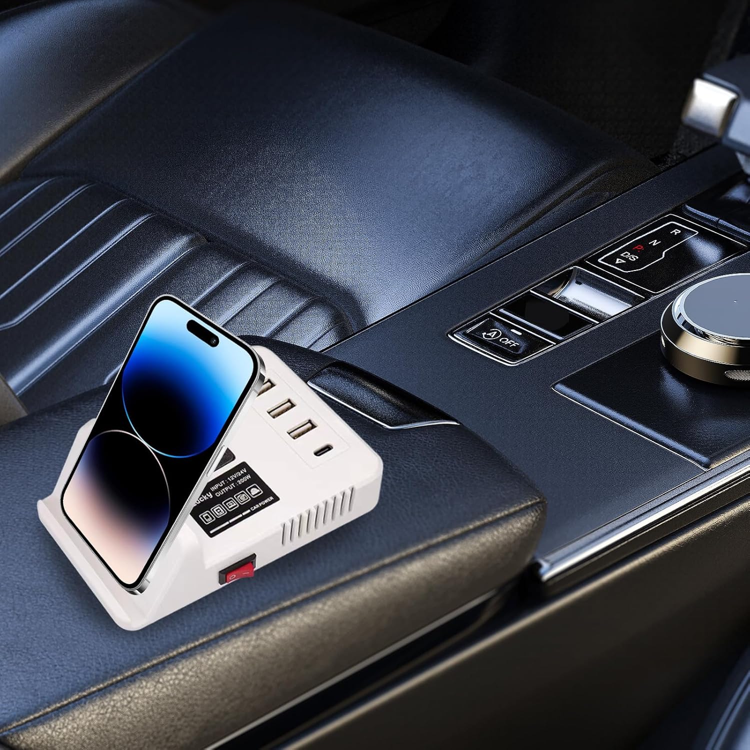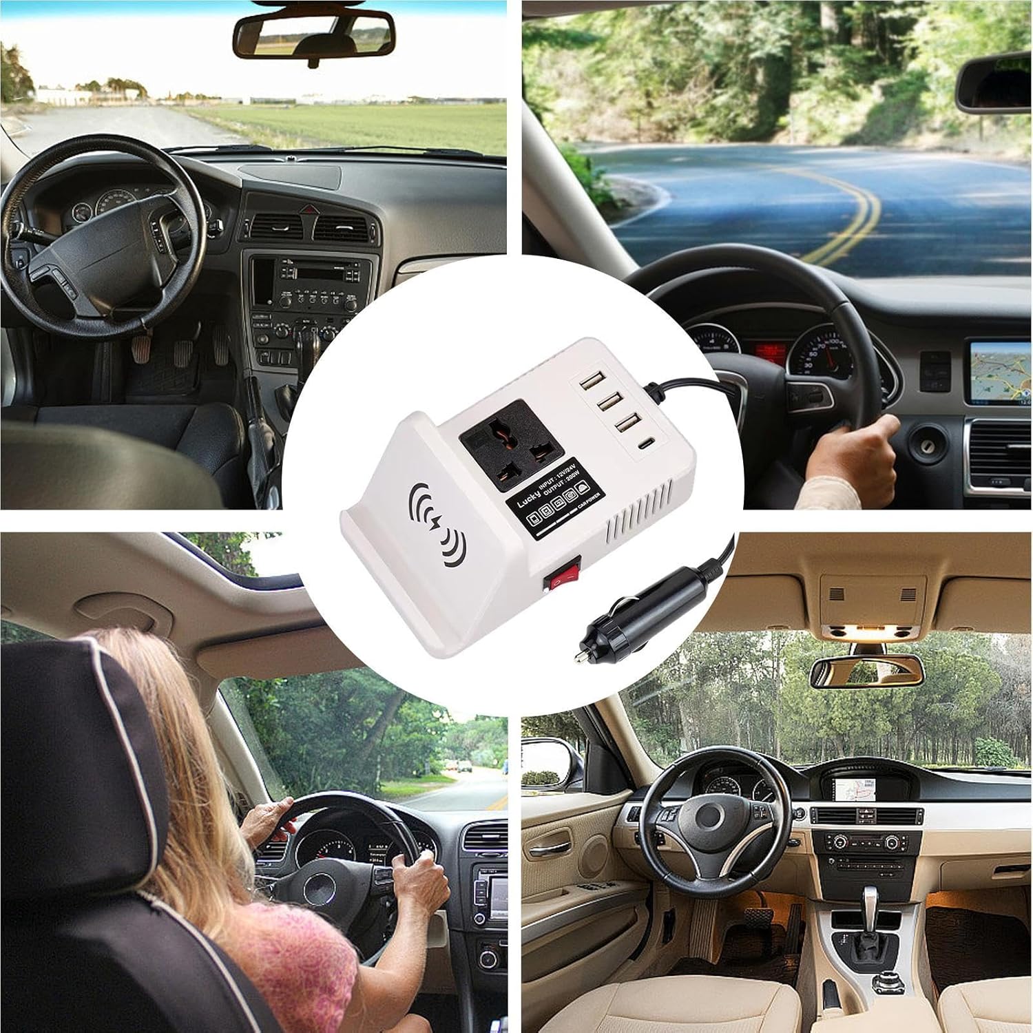 Carga rápida: con salidas, incluida una carga rápida sin inalámbrico, 3 puertos USB, un puerto tipo C y un enchufe, este inversor de automóvil ofrece una solución versátil para satisfacer las necesidades de carga de varios dispositivos al mismo tiempo.