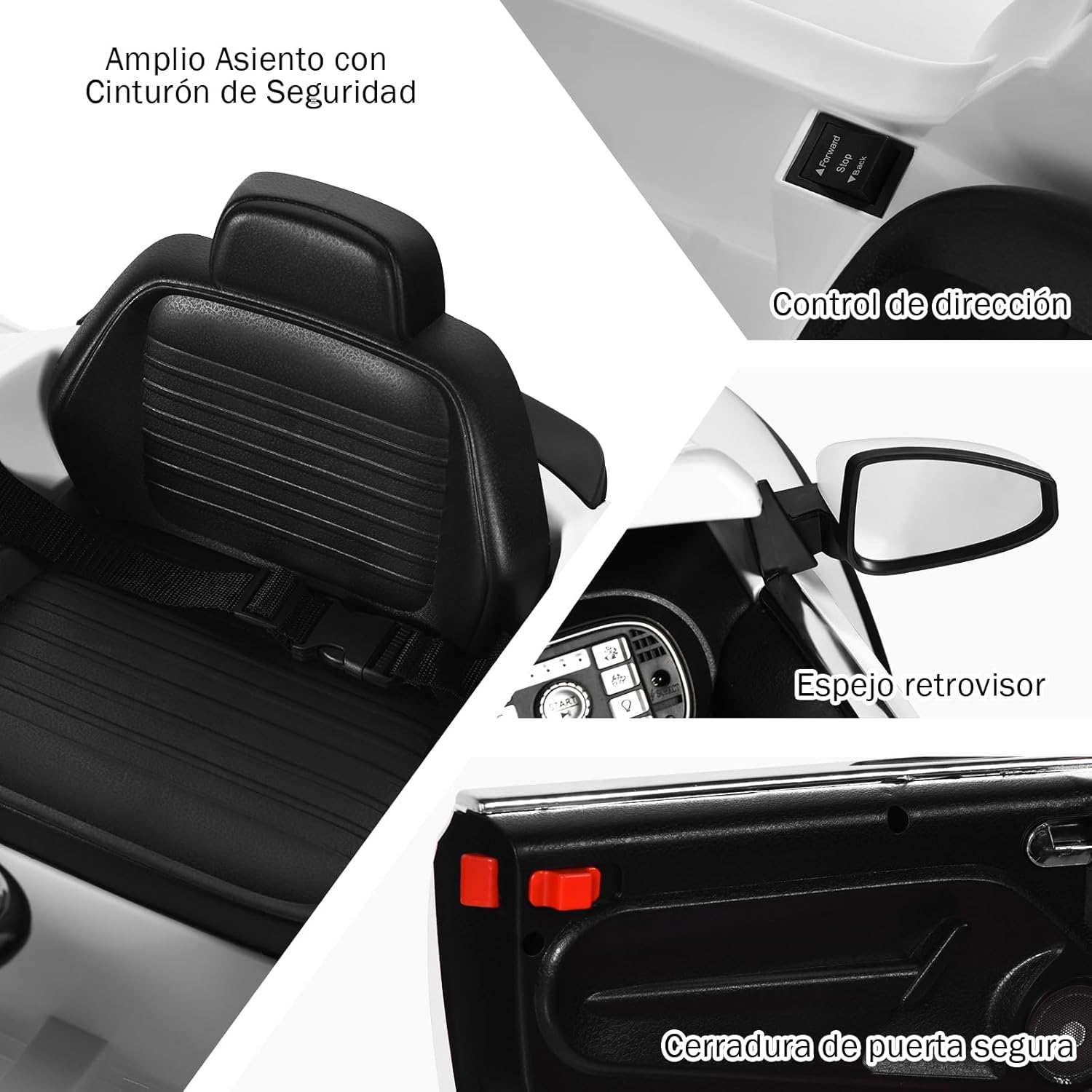 【Conducción segura y cómoda】 Los niños viajarán sin problemas gracias a la suspensión en las cuatro ruedas y al sistema de arranque lento. Dispone de un cómodo cinturón de seguridad que hace que la conducción sea segura y cómoda. Los niños pueden disfrutar de una aventura en casi cualquier terreno.