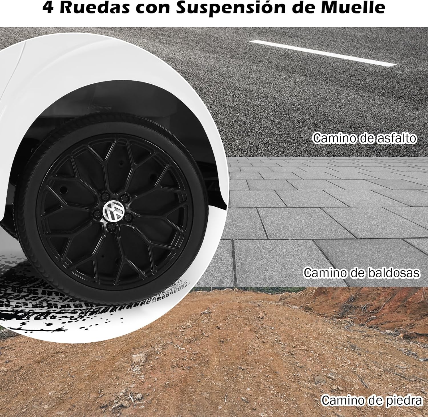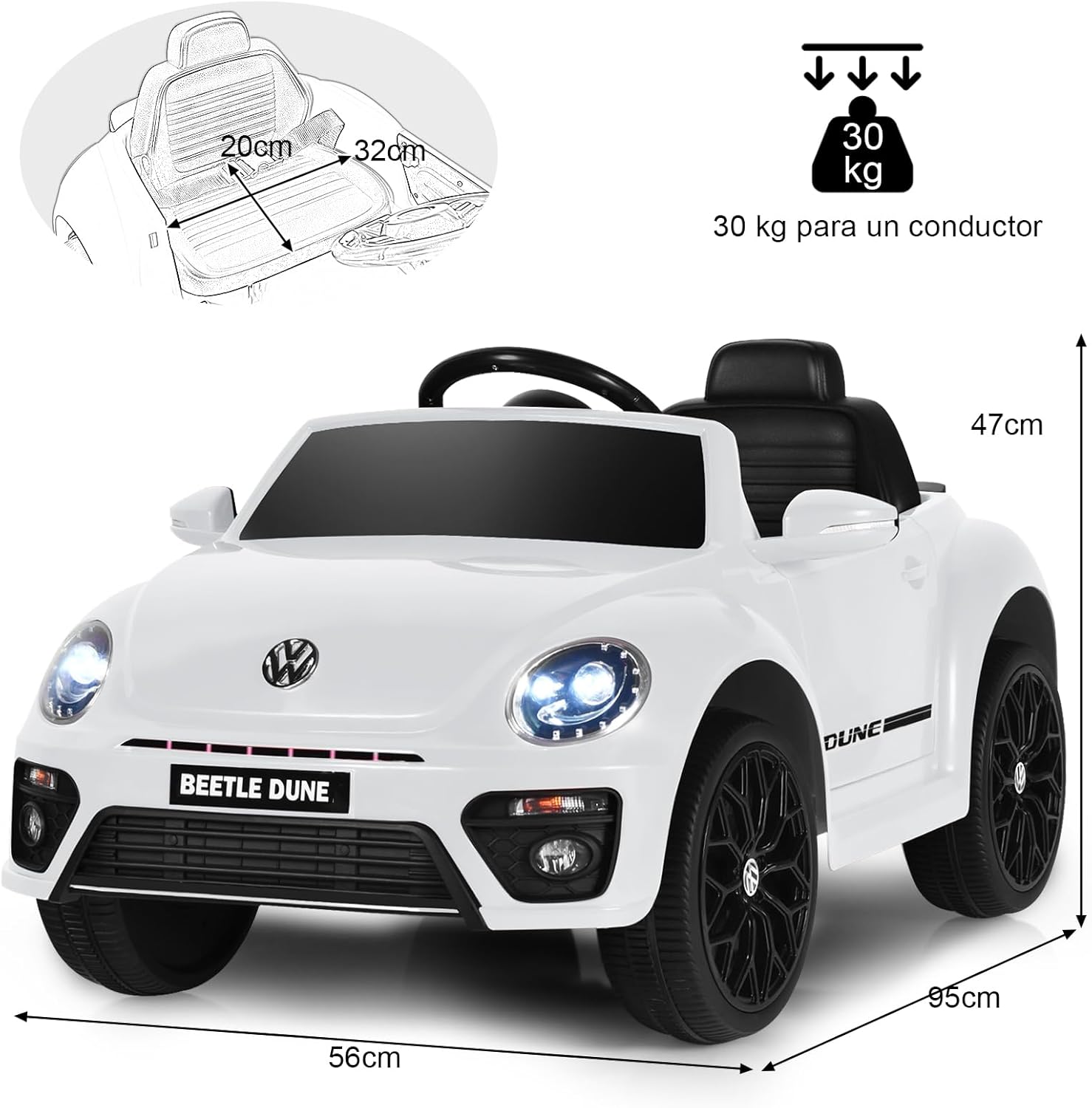 ¡Lánzate a la aventura con nuestro auto Volkswagen Beetle! Este auto tiene una apariencia auténtica con luces, sonidos, puertas dobles y un interruptor direccional para que los niños experimenten la conducción. Puede ser controlado por niños para una conducción independiente o por control remoto para padres. El sistema de suspensión de resorte en las 4 ruedas proporciona una conducción suave y el arranque lento controla la velocidad y la seguridad. La batería de 12 V 4,5 AH proporciona una capacidad duradera para garantizar de 1 a 2 horas de diversión para niños de 37 a 96 meses.