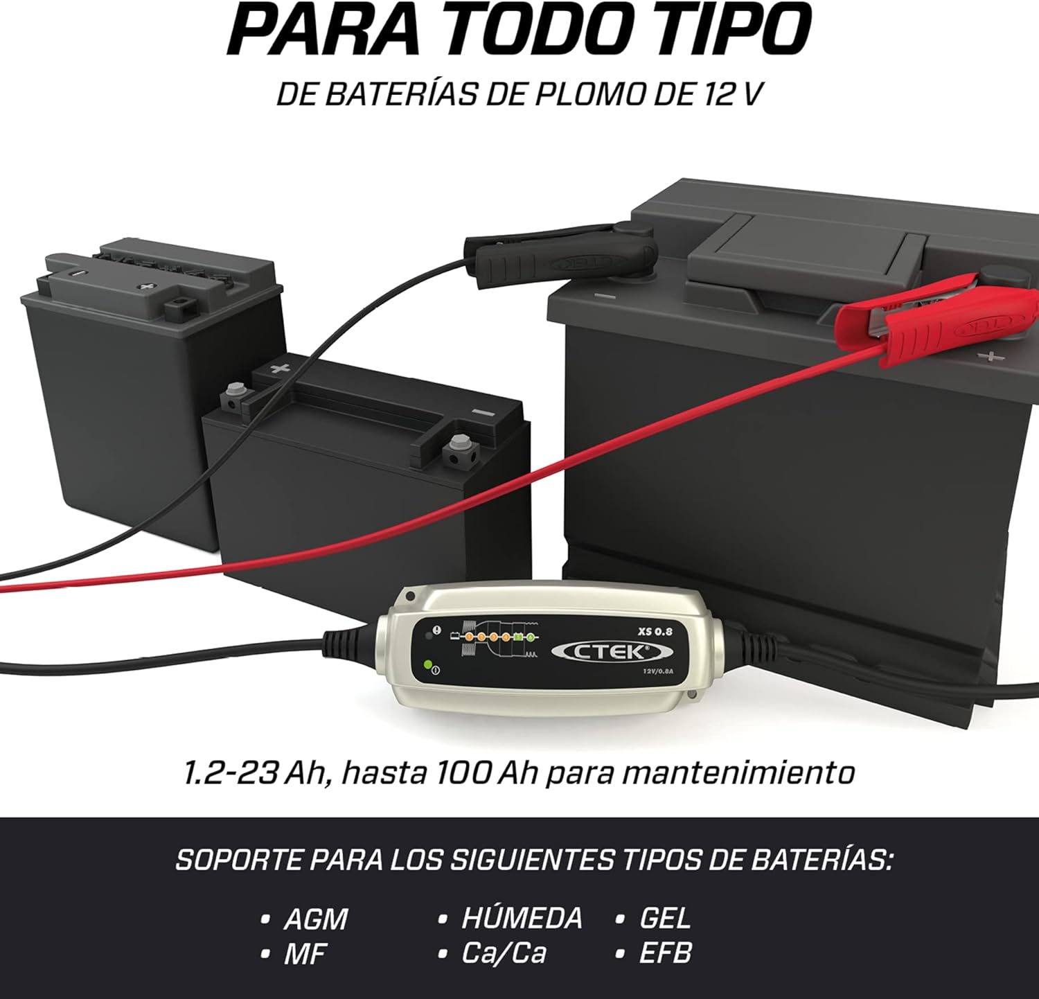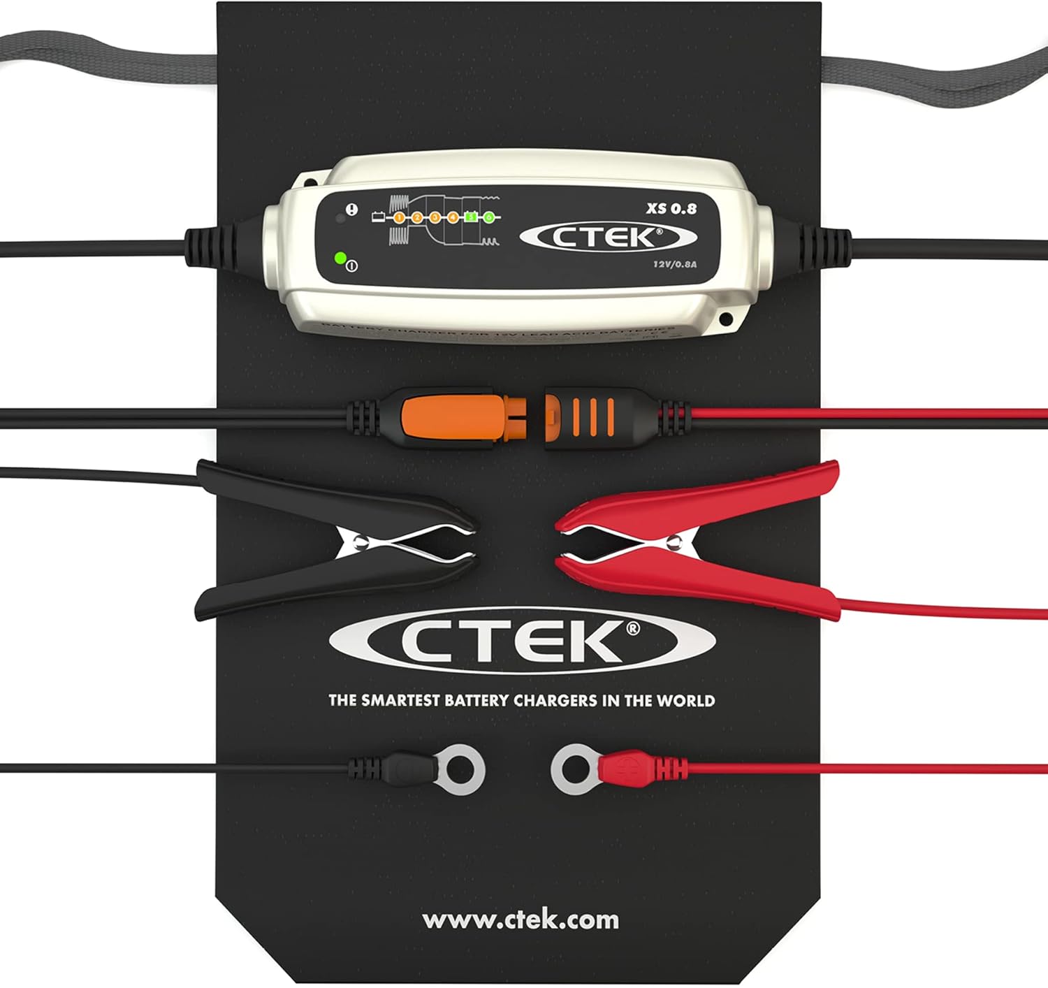 XS 0.8 posee pinzas protegidas contra polaridad inversa y antichispas. También es una prueba de salpicaduras, polvo y cortocircuitos, con tecnología avanzada para asegurarse de que no haya sobretensiones o picos.
