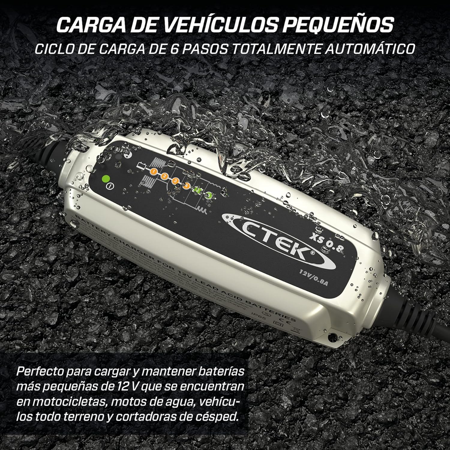 Características Cargador y mantenedor de batería de 12 V compacto e inteligente Ideal para baterías más pequeñas Cargador inteligente de 6 pasos totalmente automático Conectar y olvidar Función de desulfatación patentada A prueba de salpicaduras, a prueba de polvo ya prueba de cortocircuitos No generan chispas y están protegidas contra polaridad inversa. No es necesario desconectar la batería: el XS 0.8 no dañará los sistemas eléctricos del vehículo