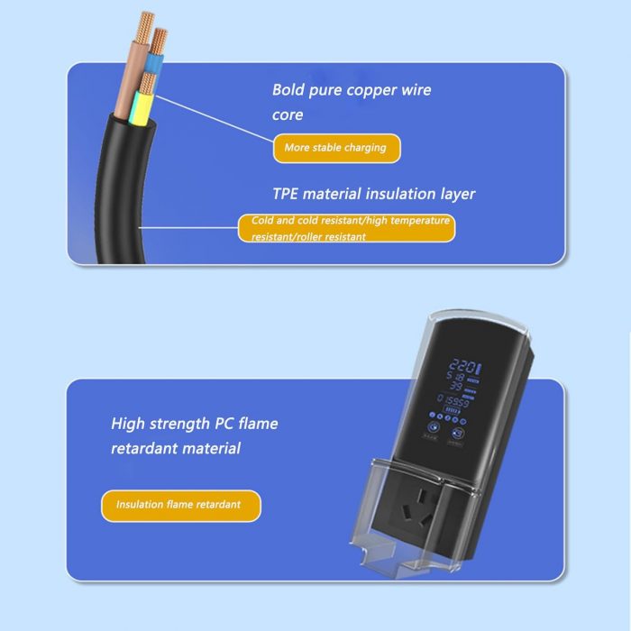 This electric car charger has TPE material insulation layer with pure copper wire core, high-strength PC fireproof material, more stable load, cold and cold resistance, high temperature resistance and rolling resistance. No grounding wire, scheduled charging, fully charged and disconnected, voltage display, battery level display, rain and dust prevention, display/temperature control protection. Compact and lightweight, easy to carry and better for travel. Applicable to 99% of vehicle models. No grounding wire required.