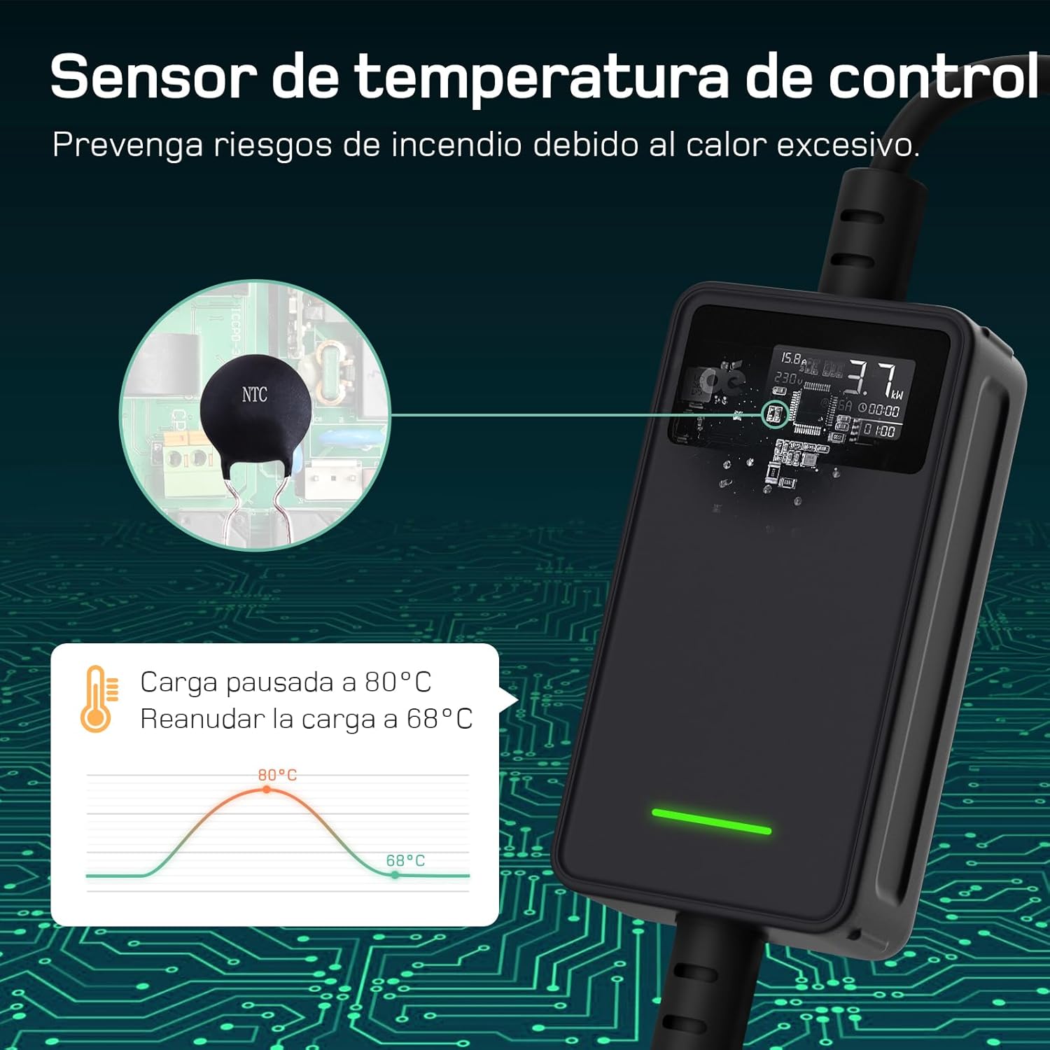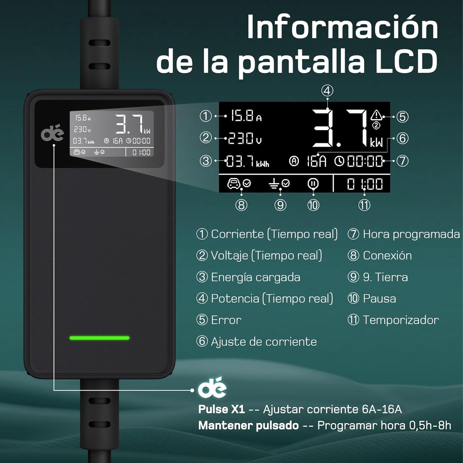 【Versátil y eficiente】El cargador EV portátil tipo 2 “dé” ofrece configuraciones de corriente ajustables de 6 A a 16 A para una carga personalizada. Es compatible con sistemas solares de tejado, optimizando el uso de energía renovable. La función de temporización de 0,5 a 8 horas le permite programar la carga durante las horas valle, ahorrando costes. Además, la pantalla LCD proporciona un seguimiento en tiempo real del estado de carga.