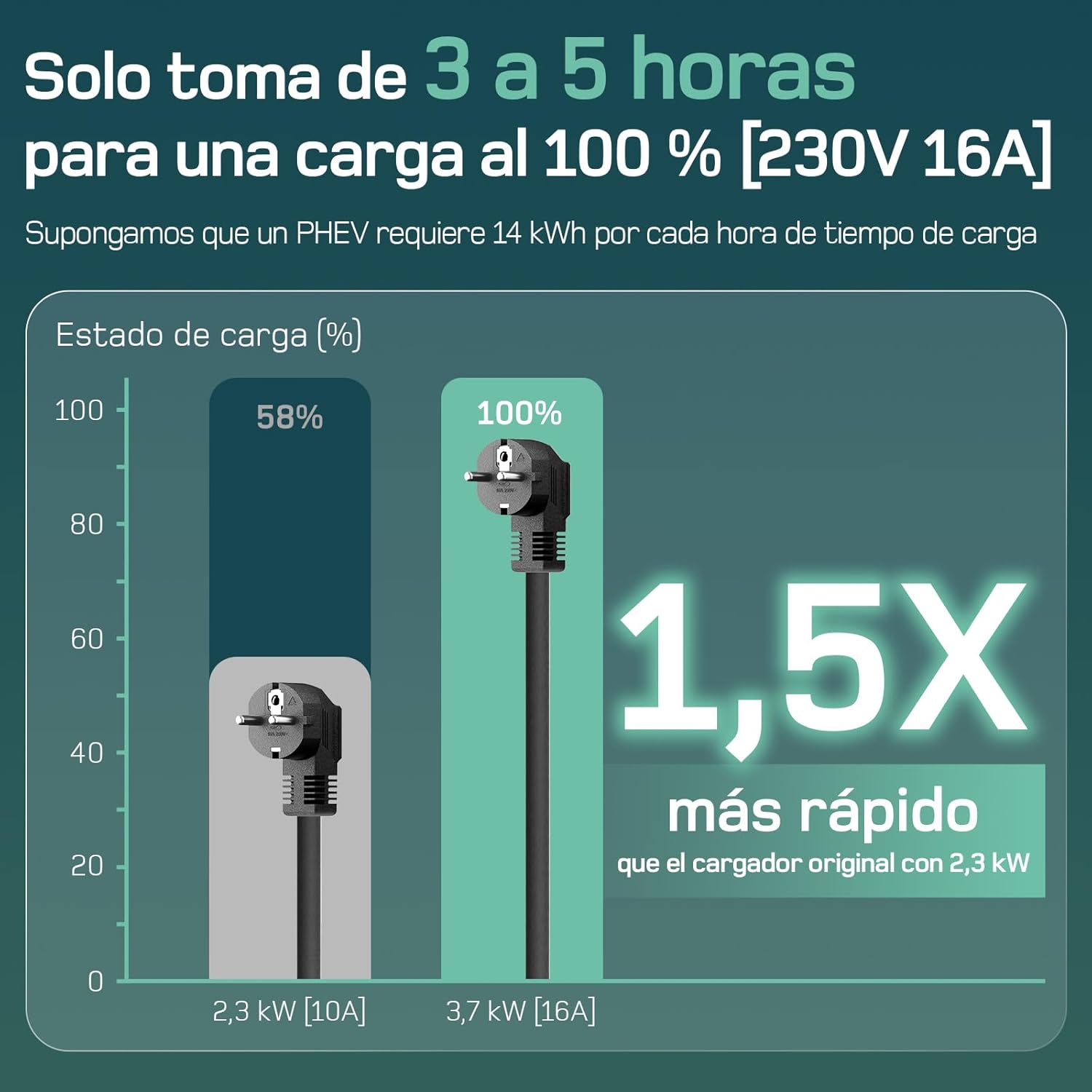 【Cargue más rápido, comience antes】El cargador de coche eléctrico “dé” es 1,5 veces más rápido que los modelos tradicionales, lo que reduce significativamente el tiempo de carga. Con enchufe Schuko de 16A y regulable entre 6A y 16A, ofrece la flexibilidad que se adapta a tus necesidades. Ofreciendo hasta 3,7 kW por hora (230 V x 16 A), cargue su vehículo híbrido enchufable del 0 % al 100 % en 3 a 5 horas. Di adiós a las largas esperas y da la bienvenida a más tiempo en la carretera.