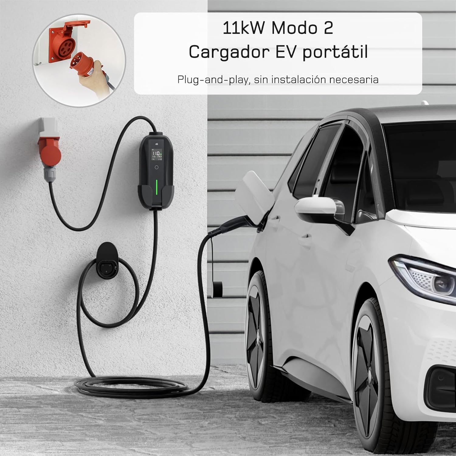 【Sin instalación】 Cargador de coche eléctrico de 11KW, no requiere instalación, solo necesita un enchufe CEE, más sencillo y económico. Ligero y portátil, utilice un cargador de pared móvil en casa o mientras viaja.