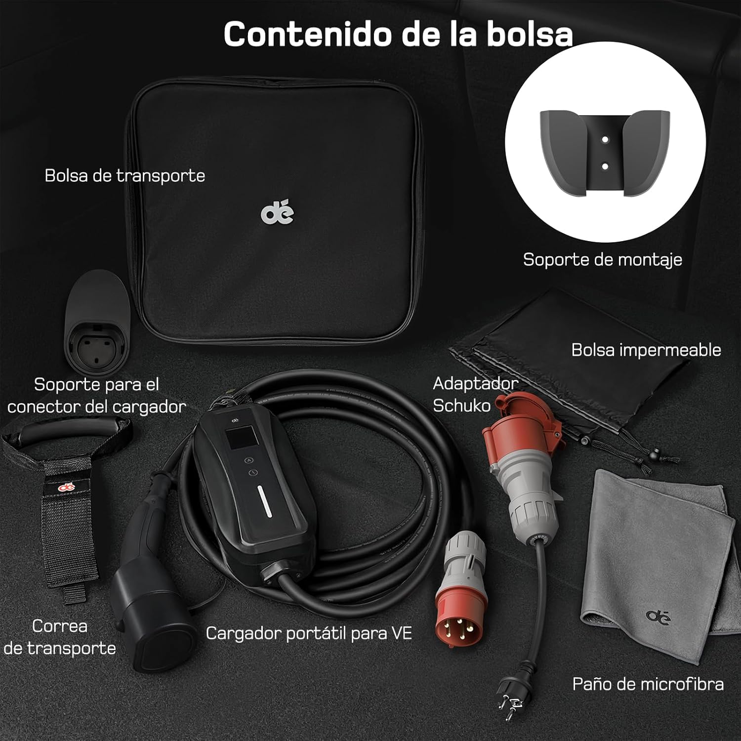 【Paquete todo en uno】Nuestro paquete incluye un cargador EV tipo 2 “dé” (11kW), junto con una bolsa impermeable, bolsa de transporte, correa, paño de microfibra y adaptador de enchufe schuko. La bolsa plegable cabe perfectamente en el maletero sin ocupar mucho espacio y la correa de transporte añade comodidad para transportarla o colgarla en la pared. Además, el paño de microfibra facilita la limpieza.