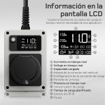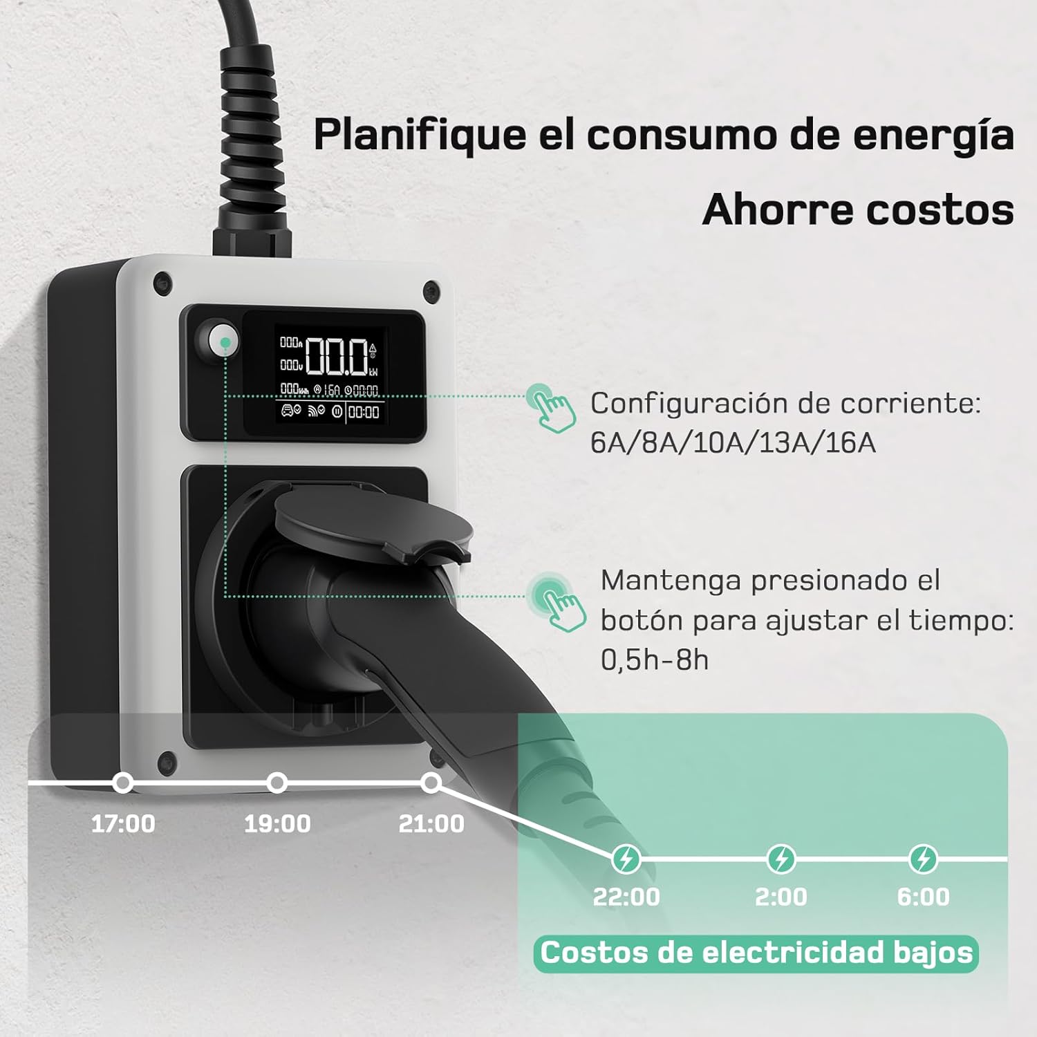 Corriente de carga ajustable: ajuste la corriente con solo presionar un botón (6A/8A/10A/13A/16A). El tiempo de carga retrasado se puede configurar manteniendo pulsado el botón (0,5 h-8 h). No es necesario realizar operaciones complicadas a través de la aplicación, la configuración se realiza directamente en el cargador.
