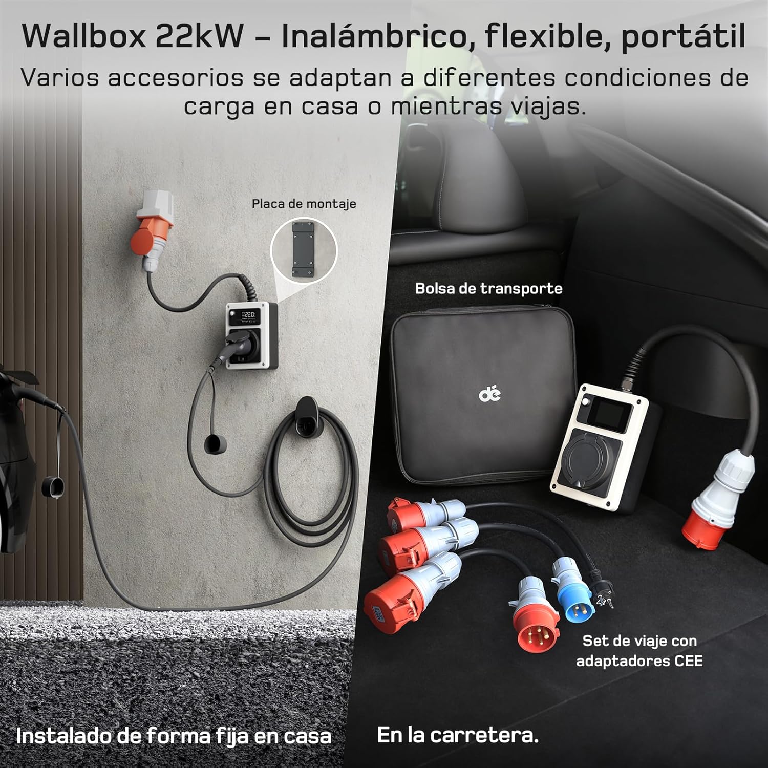 El paquete incluye: Adaptador CEE trifásico 32A a CEE trifásico 16A, adaptador CEE monofásico 16A a CEE trifásico 32A, adaptador Schuko monofásico 16A a CEE trifásico 32A, paño de microfibra, 3 tarjetas RFID y herramientas de montaje para instalación en pared. Para un uso óptimo en casa o mientras viaja