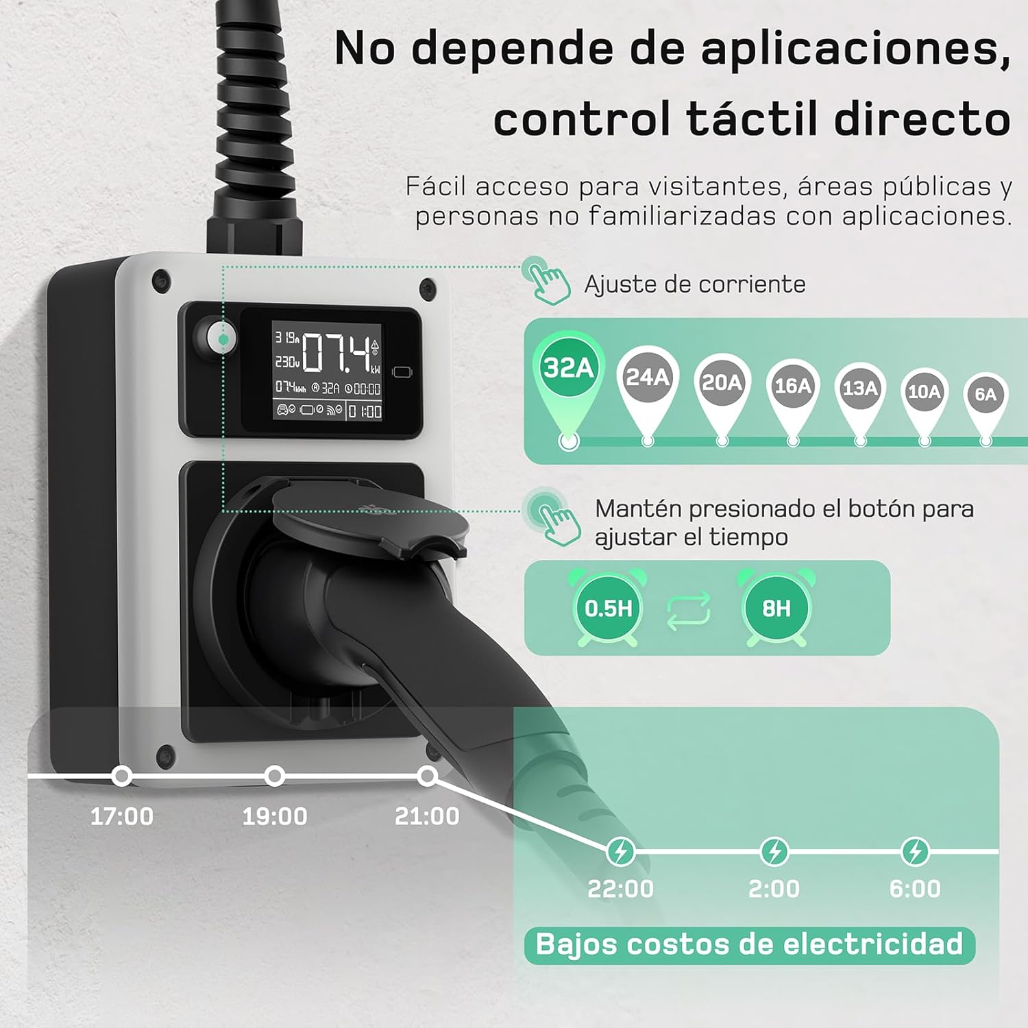 【APP Free Operation】Easily adjust the current with the touch of a button (6A/10A/13A/16A/20A/24A/32A). Set the delayed charging time using the hold button (0.5h-8h). All settings can be done directly in the Wallbox, without using an app.
