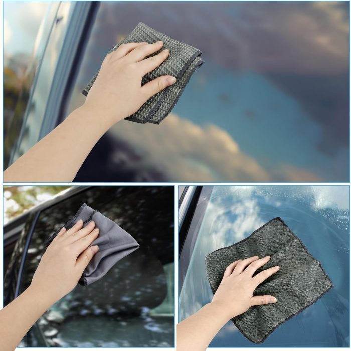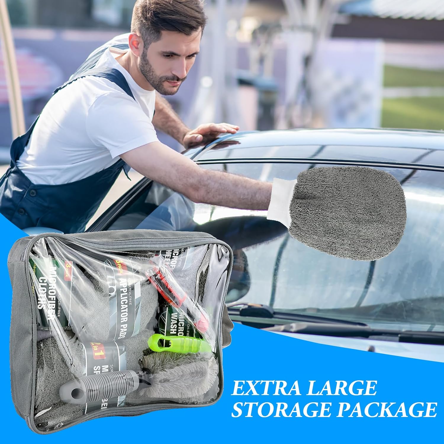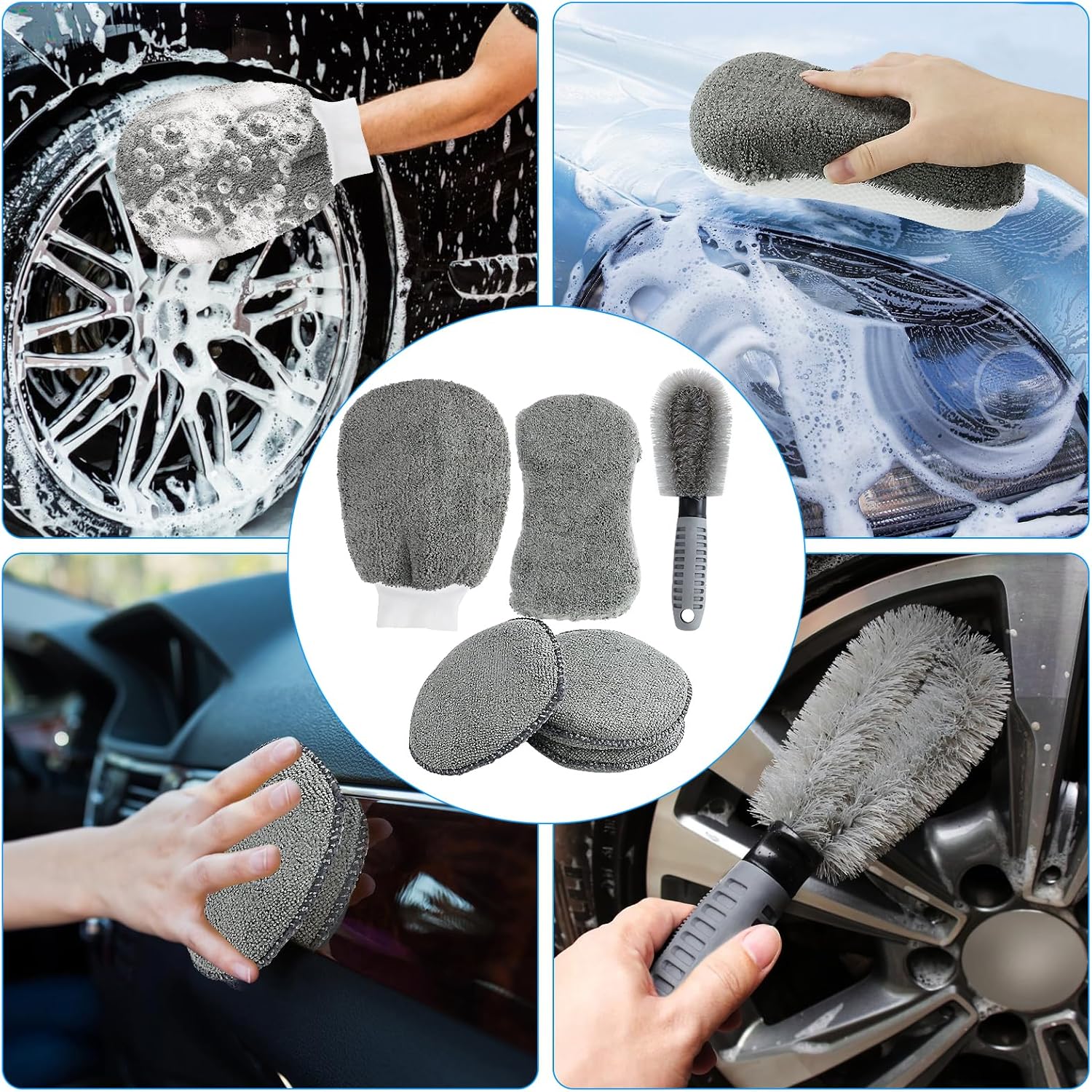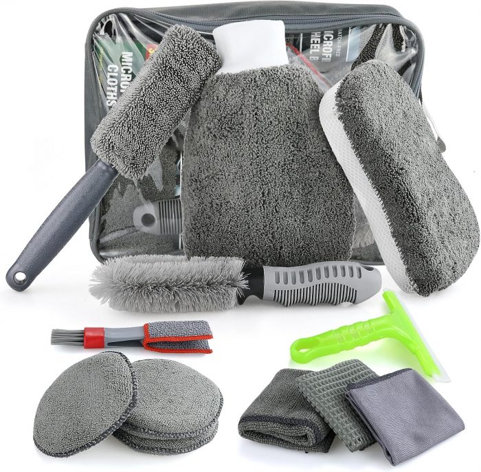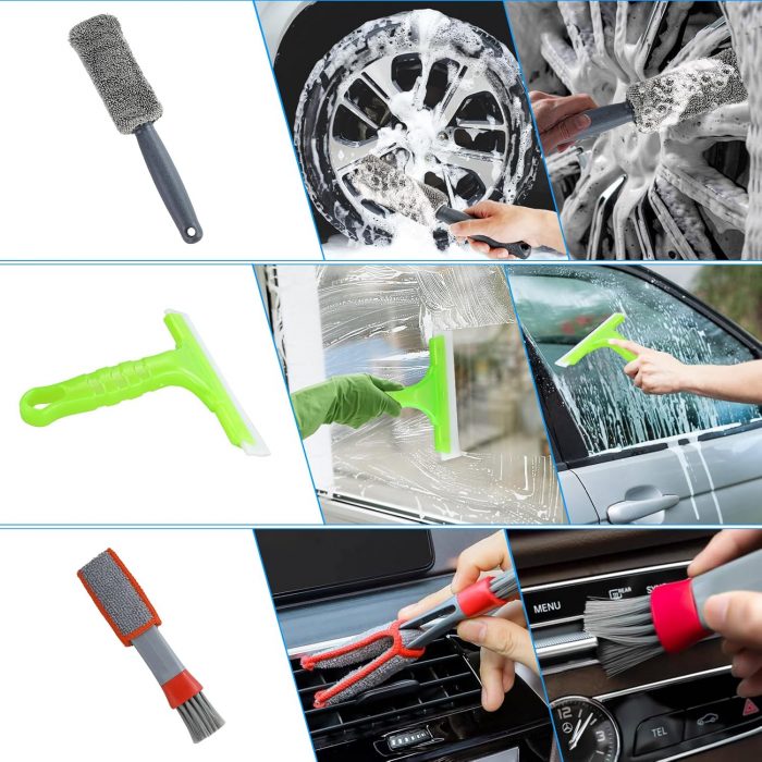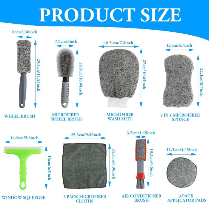 ITEMS LIST Our product includes: 3 x microfiber cloth, 3 x polishing pad, 1 x washing sponge, 1 x double-sided washing glove, 1 x round brush, 1 x soft scraper, 1 x double-headed cleaning brush with soft bristles, 1 x ventilated brush. Complete tools to meet your daily car cleaning needs.