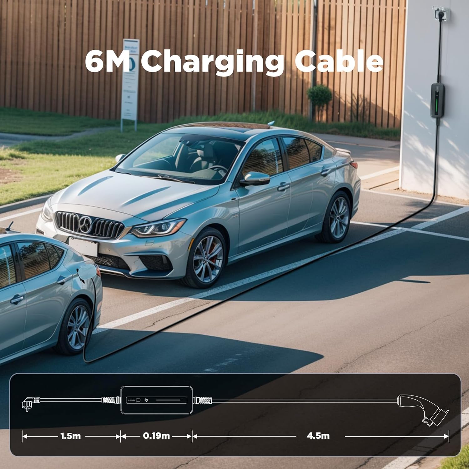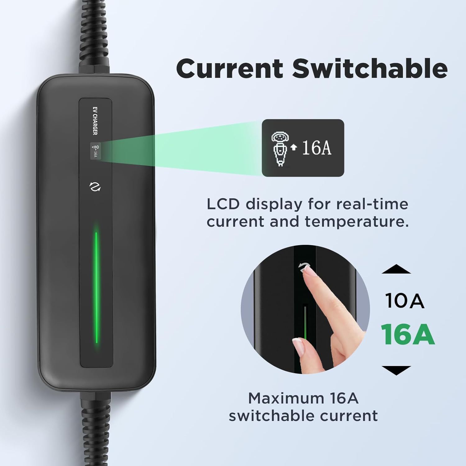 【10A/16A】Este cargador de coche eléctrico tipo 2 se puede ajustar a la corriente adecuada según sus necesidades o circuitos domésticos. 220 V – 240 V es adecuado para la mayoría de los hogares.