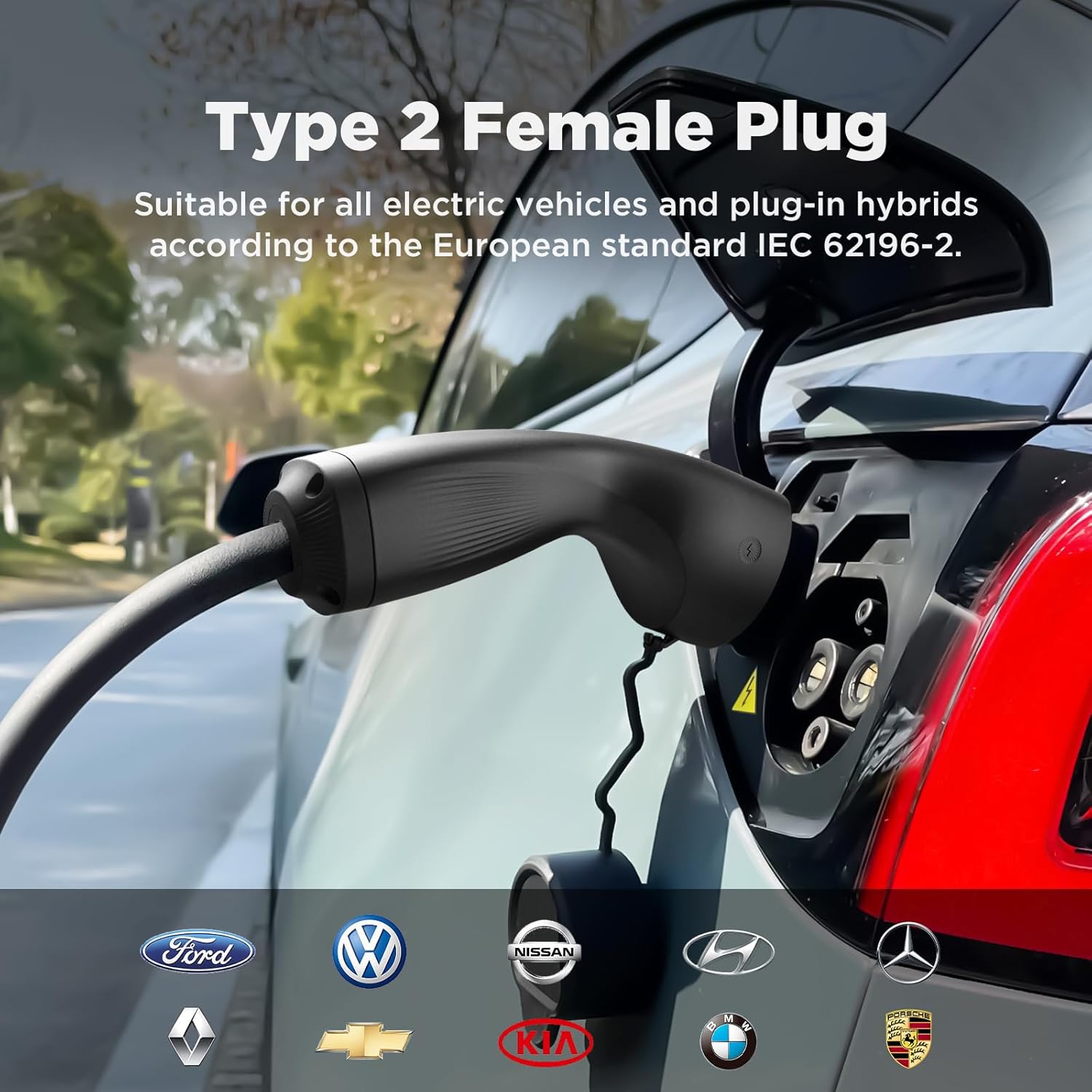 【Alta compatibilidad】El conector estándar IEC 62196-2 es compatible con todos los vehículos eléctricos y PHEV en Europa. Como Model 3 / Model S / Model X / Model Y, i3 / i8, ID.3 / ID.4, e-up!, I-Pace, Leaf, e-208, ZOE, Kona, IONIQ, EQC, E-Tron, etc.