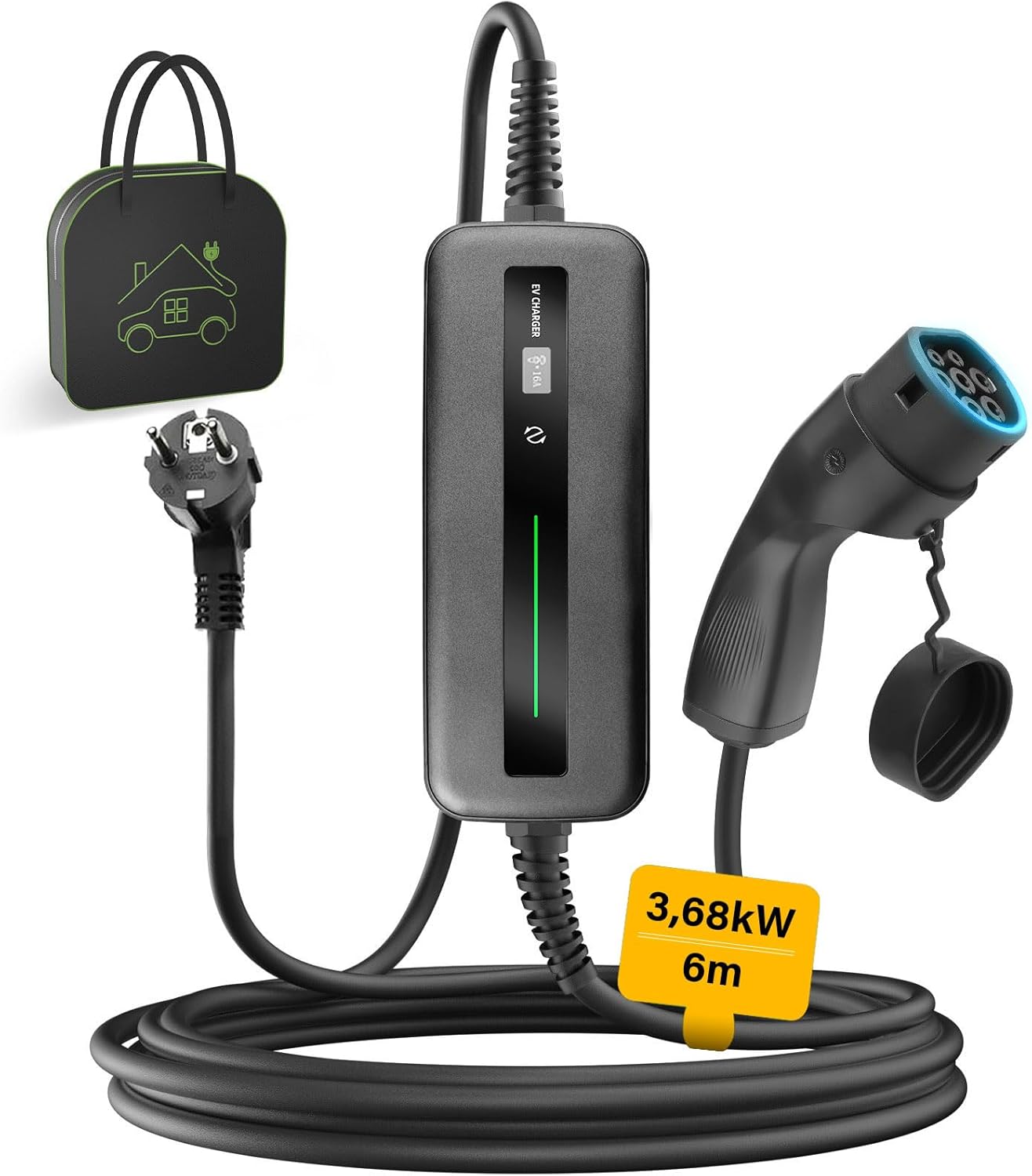 Dé Cargador de Coche Eléctrico (3,68kW, 6-16A, 8m) Cargador EV Tipo 2 con Enchufe Schuko, Cargador de Coche Eléctrico Portátil con Pantalla Digital Controlable con Modelo Y/3, GLC, MG4 y Otros BEV/PHEV