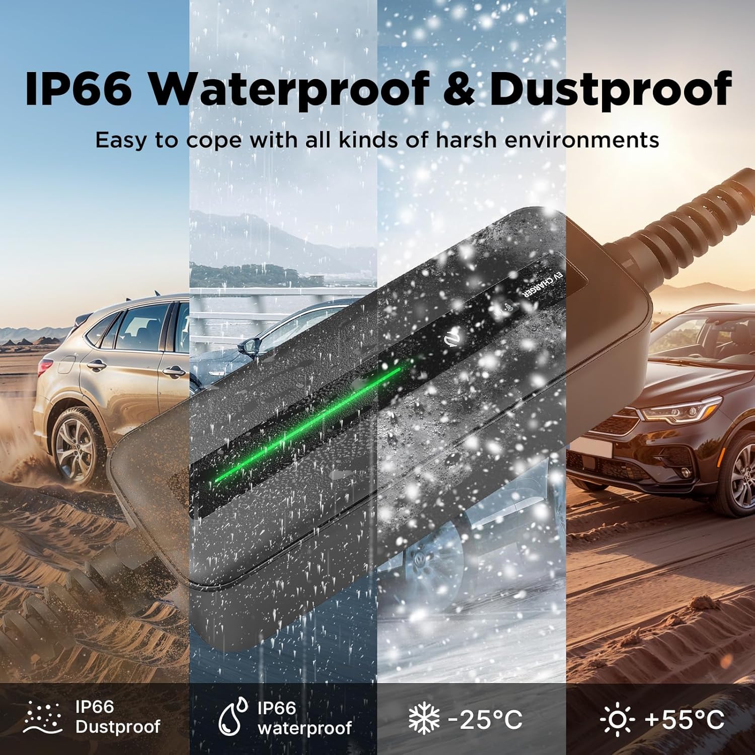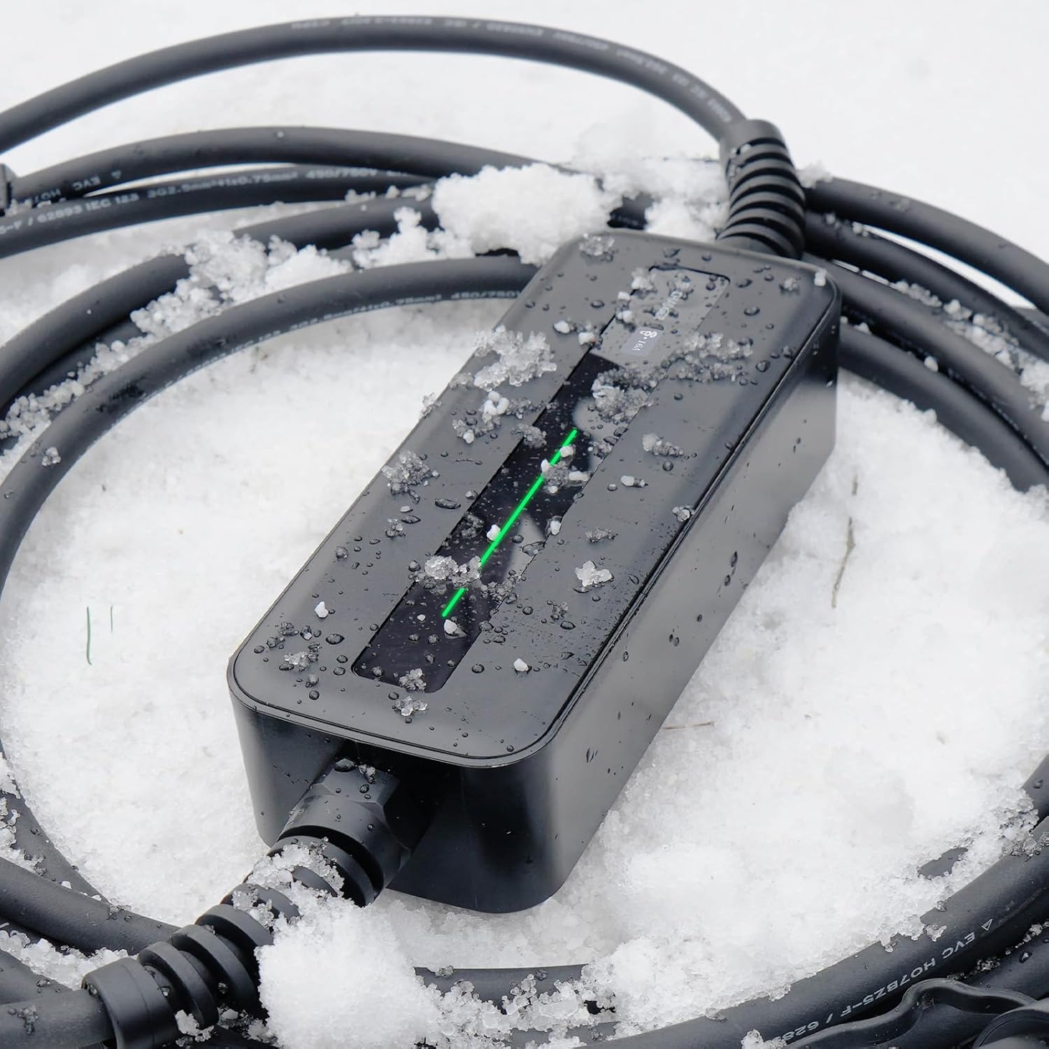 【Diseño de alta calidad】Cable de carga de TPU y carcasa de plástico ABS, con un mango de fácil agarre y una cubierta de goma en la parte superior para mantener alejado el agua y la suciedad. La luz indicada en el conector te ayuda a encontrarlo fácilmente en la oscuridad. Diseño perfecto como cargador portátil ev.