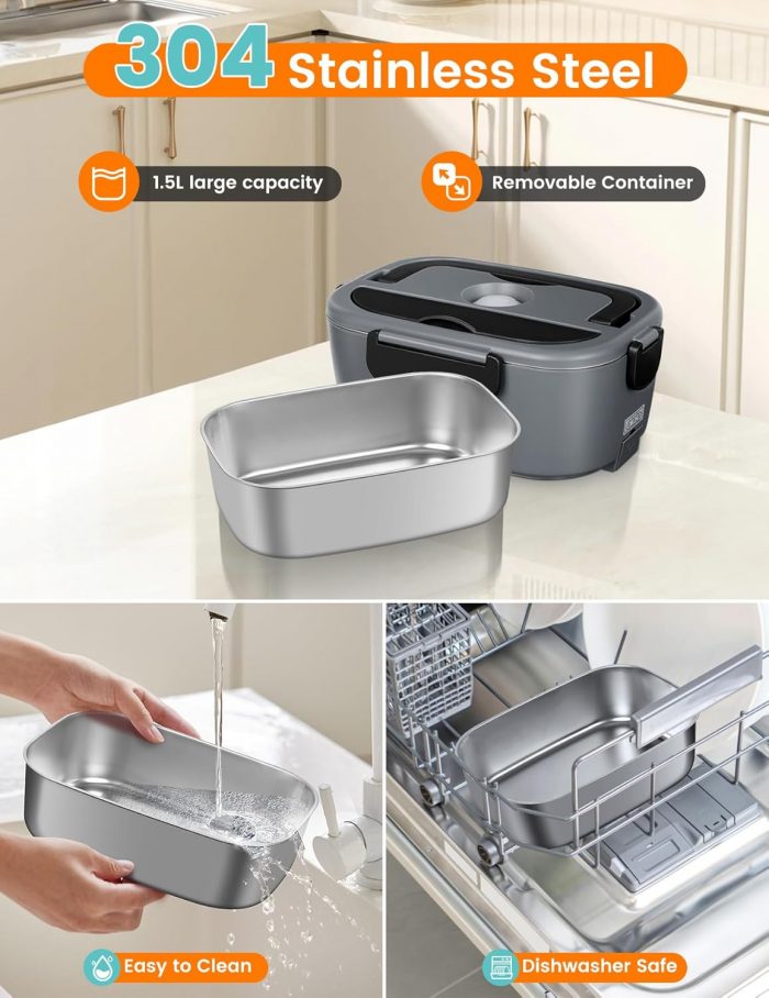 【EXTRA LARGE 1.5L CAPACITY】Enjoy hot, generous meals anywhere! This large-capacity (1.5L) heated lunch box features a dishwasher-safe 304 stainless steel food container for piping hot meals and a separate 0.45L BPA-free plastic tray for snacks/fruit (ideal for sides, not heating). Perfect for professionals with big appetites – simply plug in to heat your main meal. Effortless cleanup: both containers are dishwasher safe. (Heating base not washable).