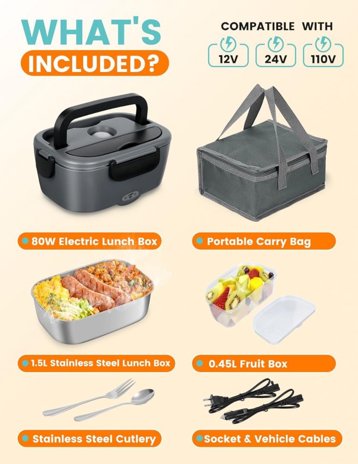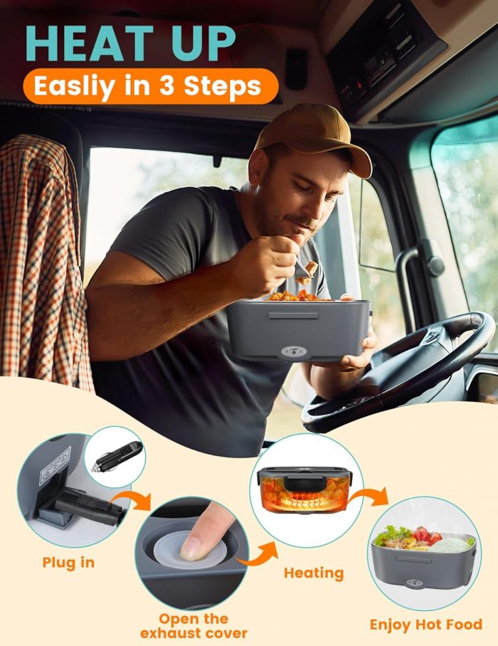 【HEAT MEALS ANYWHERE】Plug & Go! This versatile 3-in-1 portable heating lunch box with any power source (110V AC for home/office + 12V/24V DC for car/truck). Includes both cords. Simply plug in at your desk, in your vehicle, or at home. Enjoy delicious hot meals in minutes—no microwave needed. Perfect for truckers, drivers, office workers, and travelers. An essential gift for anyone on the move!