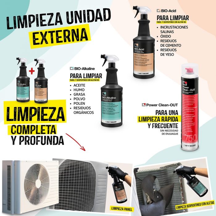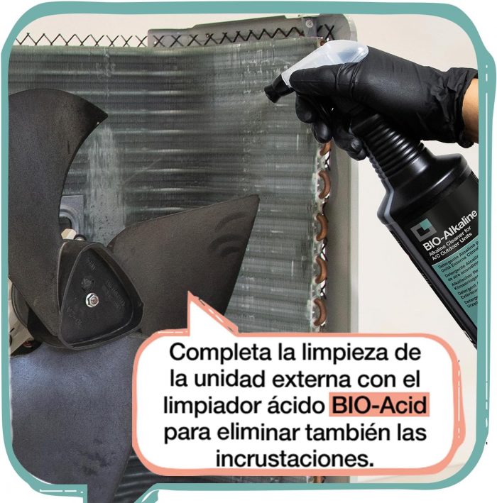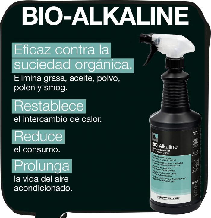 BIO ALKALINE: SPECIFIC ALKALINE DETERGENT for the removal of OIL, SMOG, FAT, DUST, POLLE, ORGANIC WASTE from the surfaces of the OUTDOOR UNIT and FIN BATTERIES