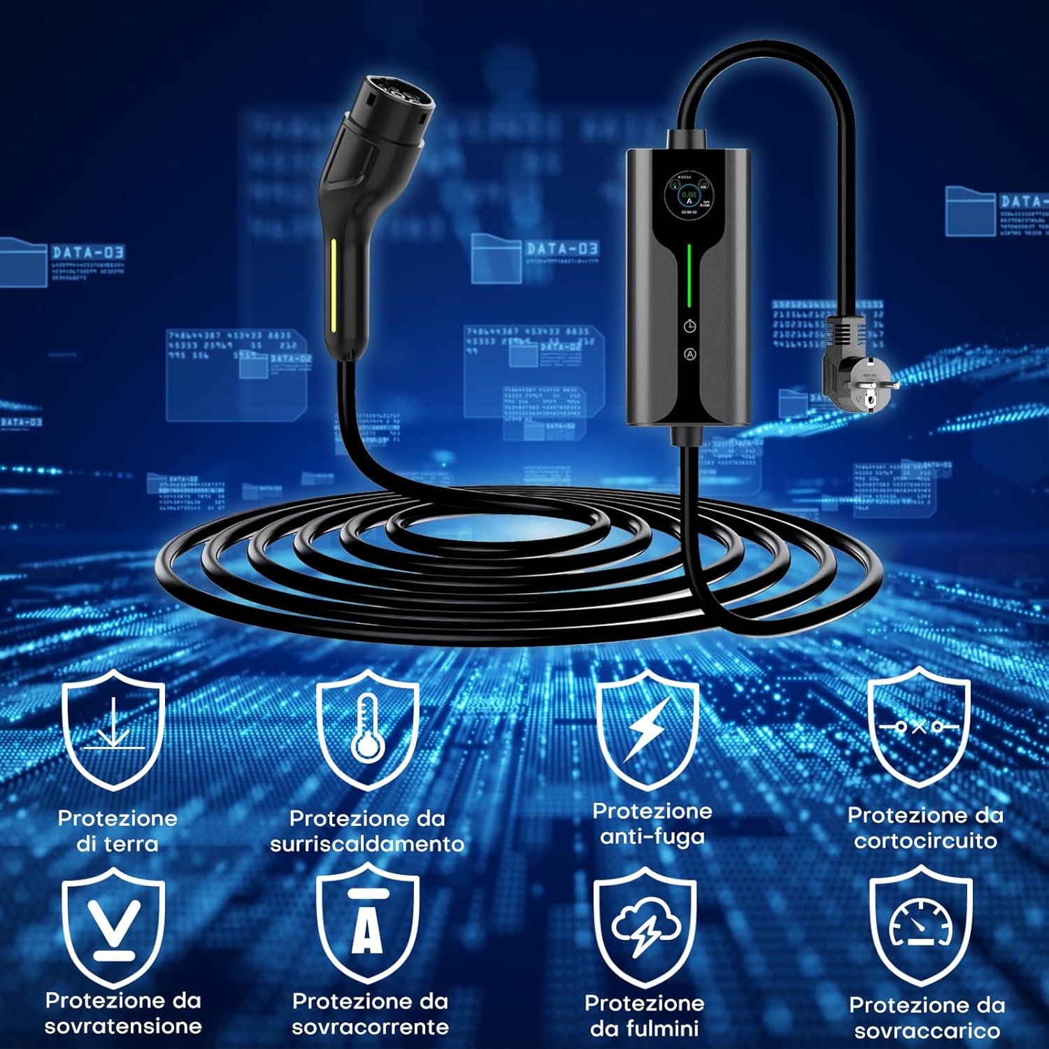 Dé Cargador de Coche Eléctrico (3,68kW, 6-16A, 8m) Cargador EV Tipo 2 con Enchufe Schuko, Cargador de Coche Eléctrico Portátil con Pantalla Digital Controlable con Modelo Y/3, GLC, MG4 y Otros BEV/PHEV