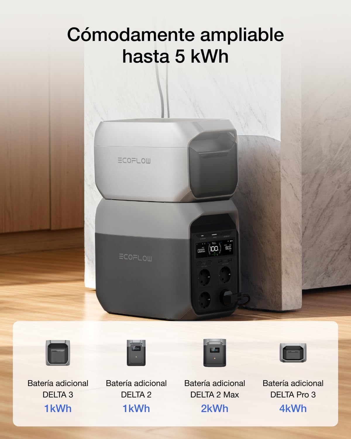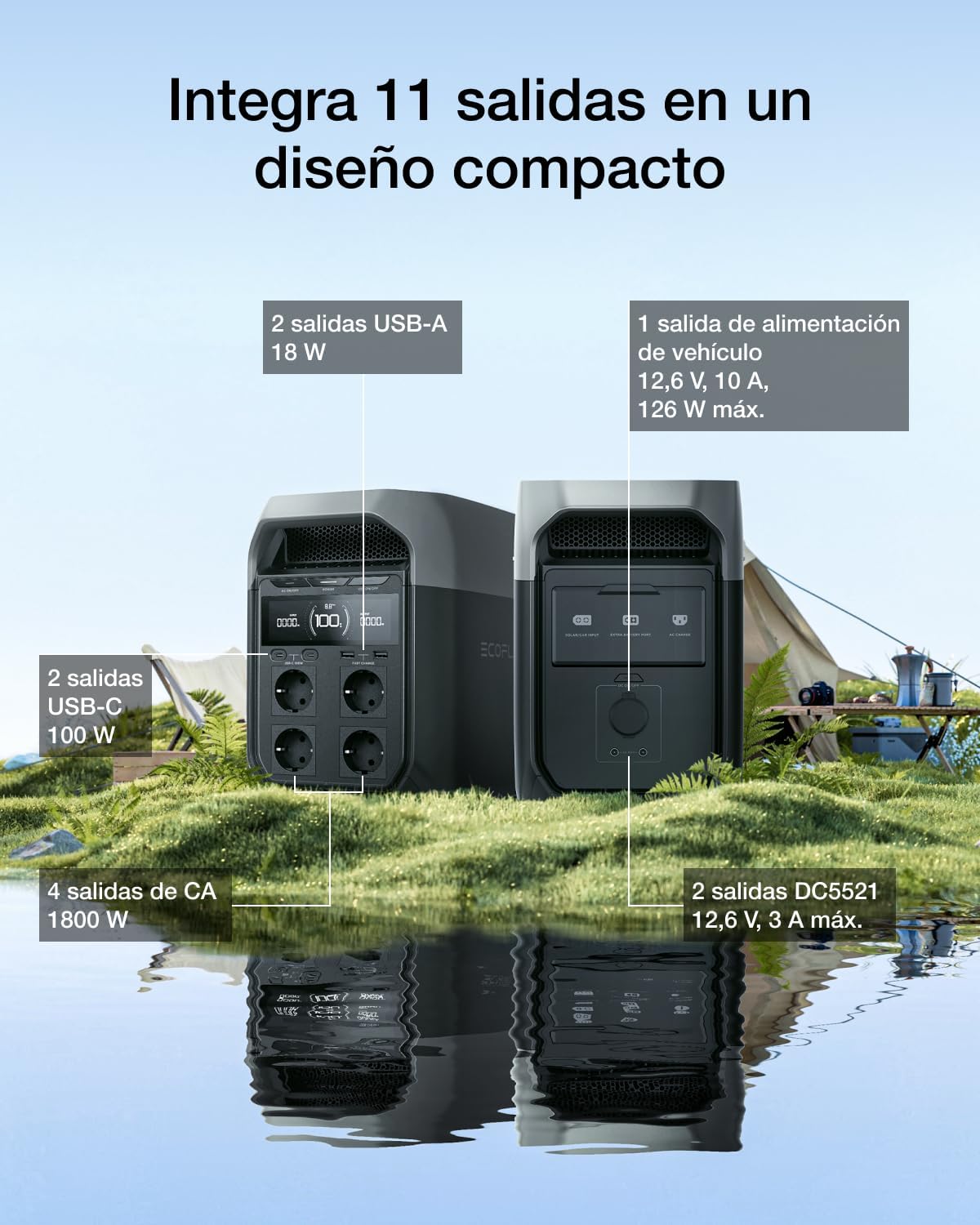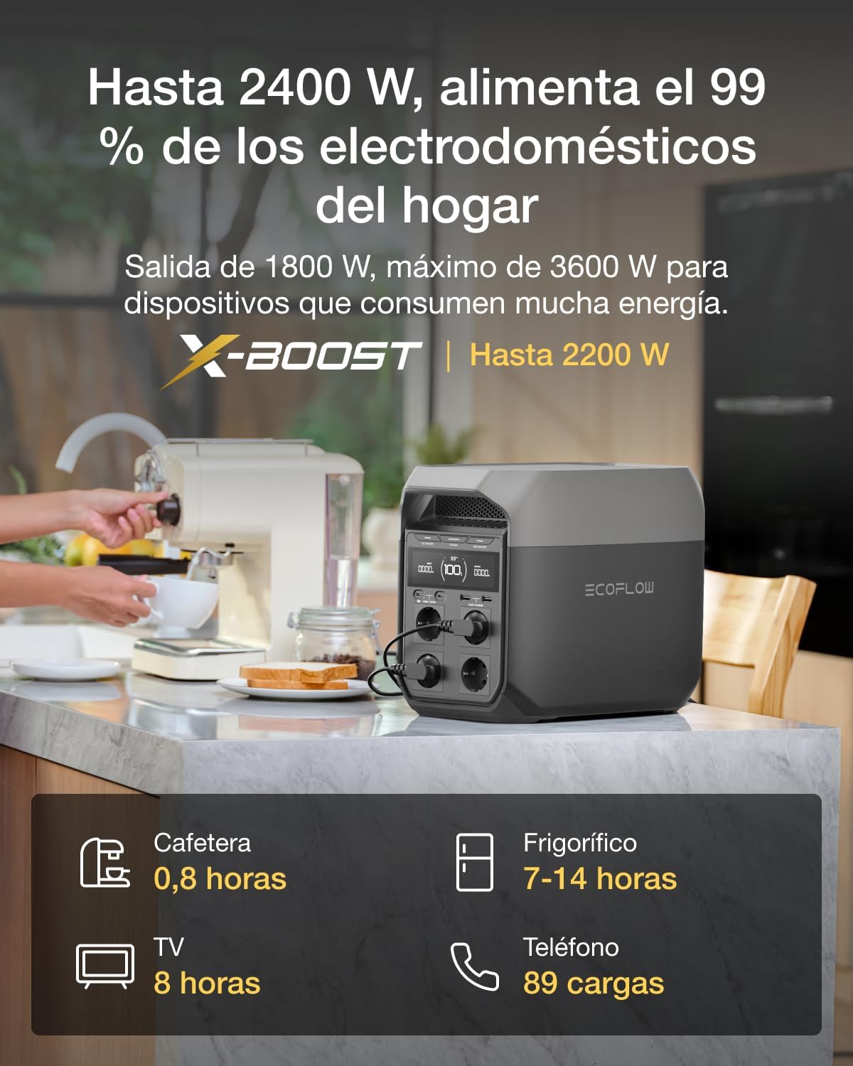 (Potencia de hasta 2400W, alimenta el 99% de los electrodomésticos) DELTA 3 ofrece una potencia de 1800W y un máximo de 3600W, por lo que puede alimentar dispositivos que consumen mucha energía. Con 11 salidas en un diseño compacto, alimenta 11 dispositivos simultáneamente y es ideal para emergencias. X-Boost te permite alimentar dispositivos que necesitan más de 2400W de forma continua.
