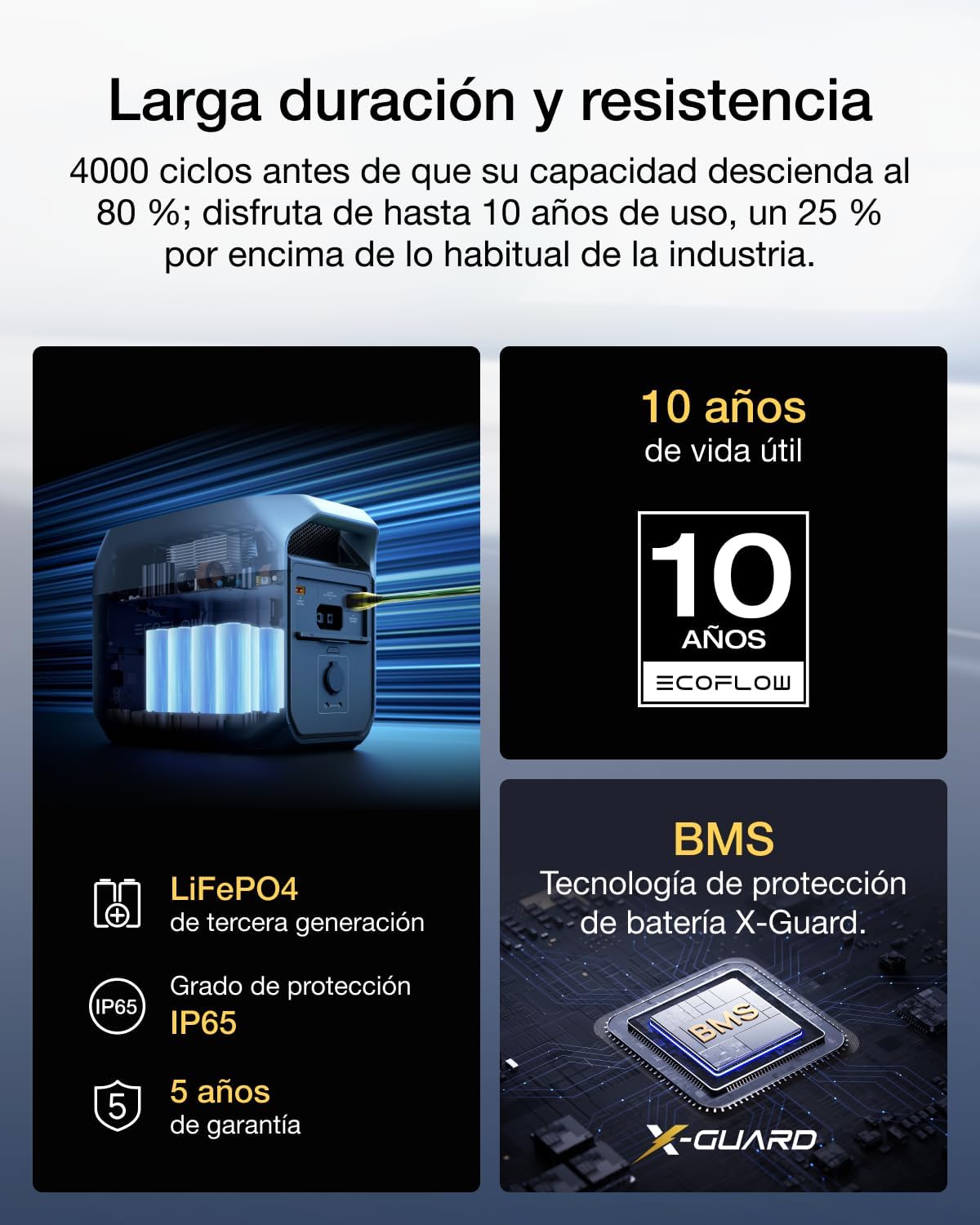 (Expansión flexible hasta 5 kWh) DELTA 3 admite paquetes de baterías DELTA Pro 3, DELTA 2 Max y DELTA 2, con una capacidad de expansión de hasta 5 kWh. Fabricado con células LiFePO4 duraderas, que ofrecen 4000 ciclos al 80 % de su capacidad durante 10 años. Los paquetes con clasificación IP65 y BMS (tecnología de protección de batería X-Guard) garantizan un rendimiento y seguridad duraderos.