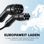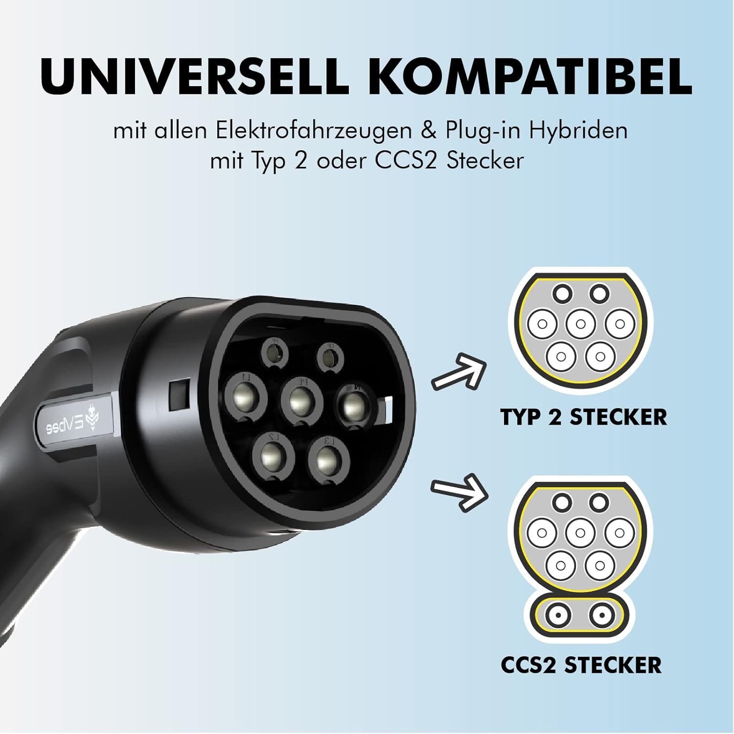 El cable de carga es universal compatible con todos los vehículos eléctricos e híbridos plug-in con conector tipo 2 o CCS2, por ejemplo, Audi, BMW, Citroen, Cupra, Fiat, Ford, Honda, Hyndai, Jaguar, Kia, Land Rover, Lexus, Mazda, Mercedes, Mini, Nissan, Opel, Peugeot, Porsche, Renault, Seat, Skoda, Smart, Tesla, Toyota, Volvo, Volkswagen, etc.