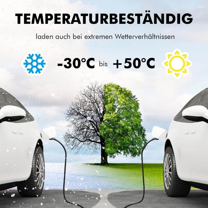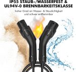 Gracias a la selección de materiales de alta calidad, el cable de carga IP55 es resistente al polvo y al agua, así como a temperaturas de -30 °C a +50 °C y con la clase de inflamabilidad UL94V-0 difícilmente inflamable. Así se carga sin preocupaciones incluso en condiciones climáticas extremas.