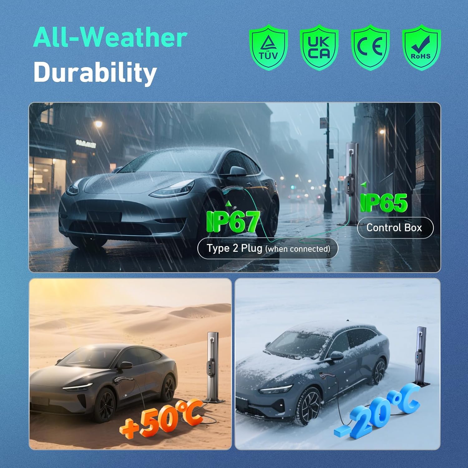 【Cable TPU Premium】El cable tiene certificación TÜV y supera las 20000 pruebas de flexión, y el enchufe hembra tipo 2 supera las 15000 pruebas de conexión, soporta fácilmente una vida útil de 15 años. Los cables de alta calidad son resistentes a la abrasión y a los enredos. Ideal para uso frecuente y prolongado. La temperatura de funcionamiento es de -30 ℃ a 50 ℃. El cable permanece flexible durante los fríos meses de invierno. No hay necesidad de preocuparse por la exposición al sol abrasador en verano.