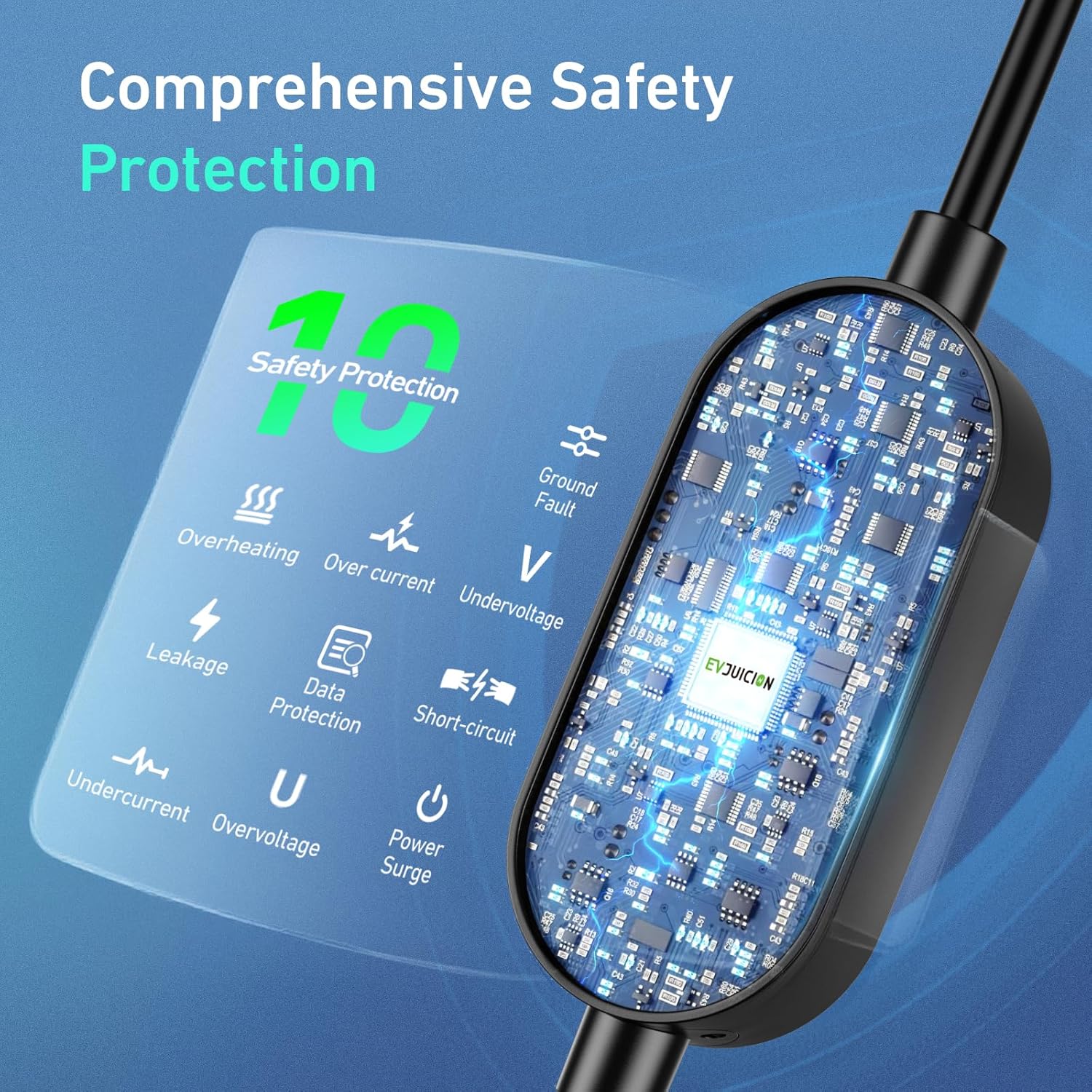 【Múltiples protecciones de seguridad】El cargador EV tipo 2 ha pasado las certificaciones CE, UKCA y UL. El chip inteligente proporciona 8 mecanismos de protección para cargadores de automóviles, incluidos sobrecorriente, sobrecalentamiento, fugas, sobretensión, subtensión y sobretensión.