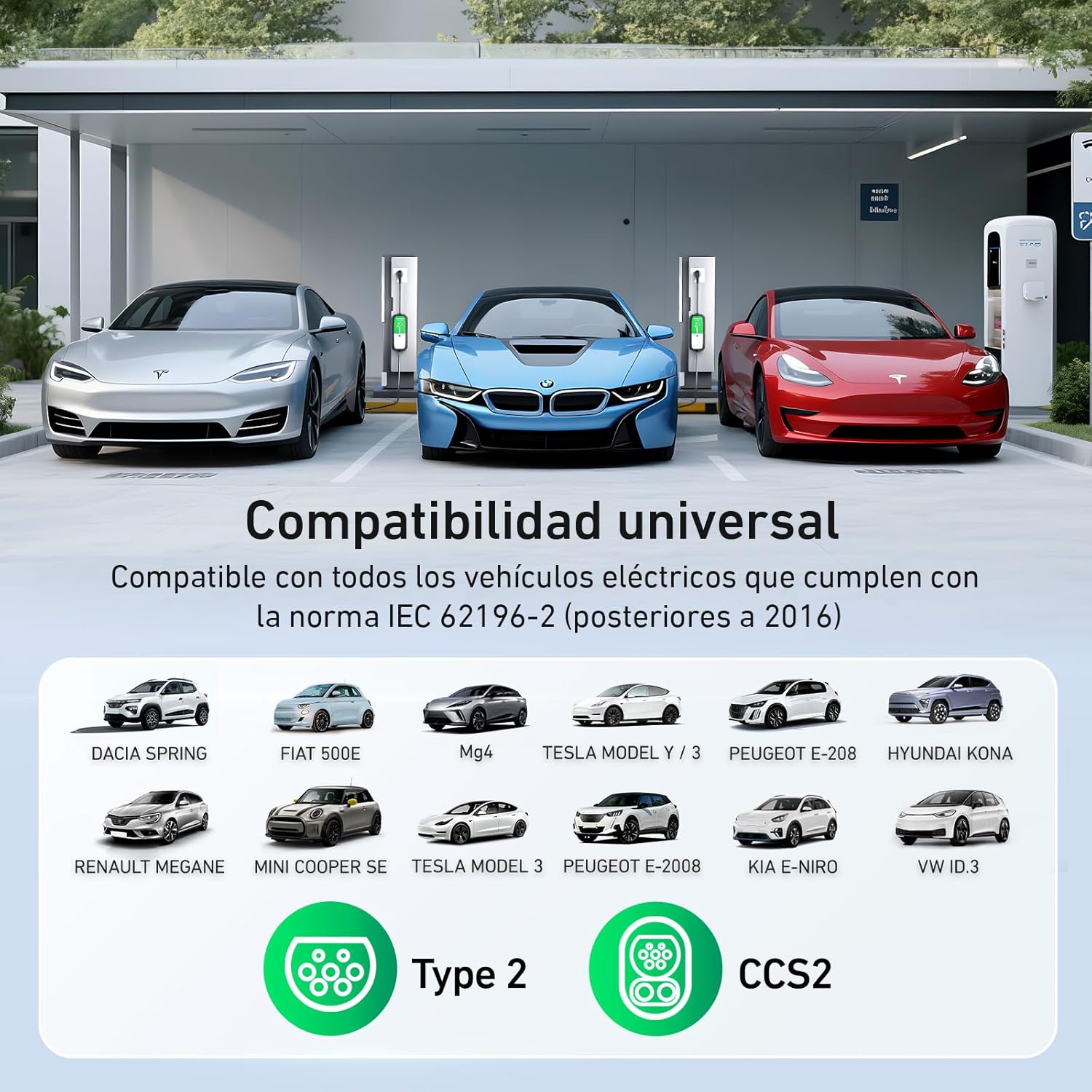 【Amplia Compatibilidad】Este cable de carga para coche eléctrico ofrece cuatro opciones de longitud: 6/8/10/15 m (total con enchufe Schuko a Tipo 2 incluyendo unidad de control), adaptándose a diversos escenarios de estacionamiento. Incluye bolsa de transporte para fácil transporte. Compatible con la mayoría de vehículos eléctricos e híbridos enchufables con conector tipo 2 en Europa, conforme a IEC 62196-2.