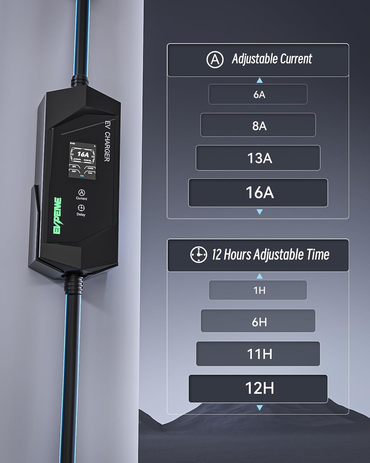 Pantalla LCD dinámica: la pantalla LCD clara de este cargador de vehículo eléctrico tipo 2 muestra datos de carga importantes como corriente, voltaje y tiempo de carga. Puedes ajustar la corriente (6/8/10/13/16A) y configurar el retraso de carga de 1 a 12 horas para optimizar costes fuera de las horas punta.