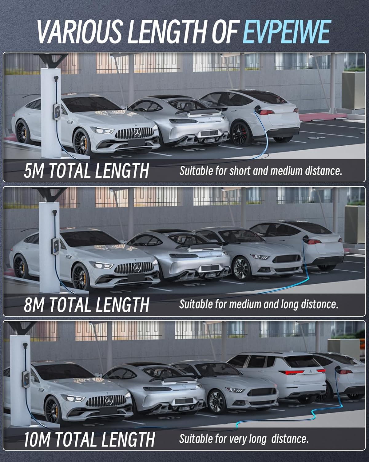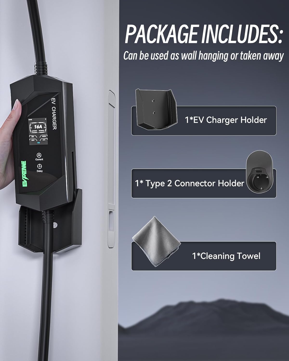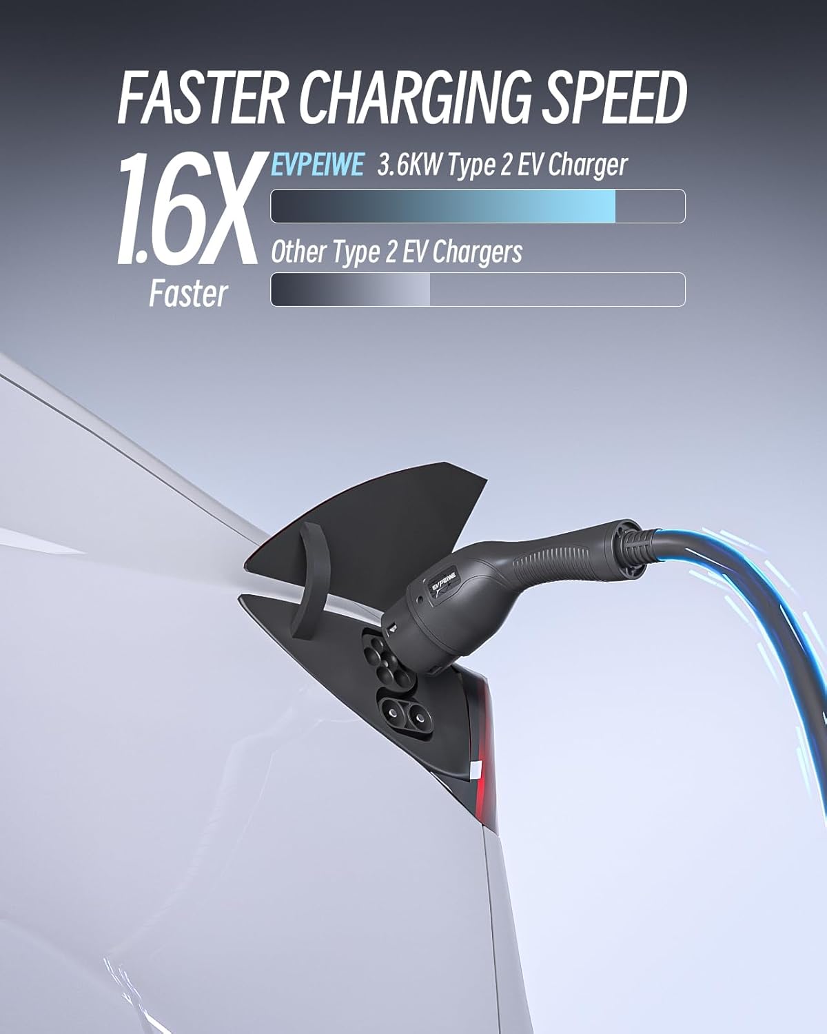 Potencia de carga rápida: El cargador EVPEIWE EV Tipo 2 ofrece una potencia de salida de 230V y 16A y una potencia de carga de hasta 3,6 kW, hasta 1,6 veces más rápido que los cargadores convencionales, lo que reduce significativamente el tiempo de carga.