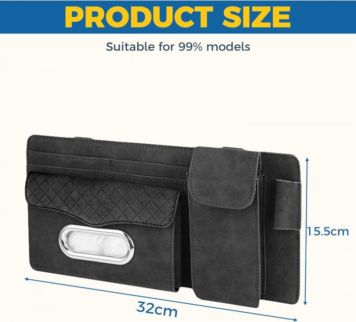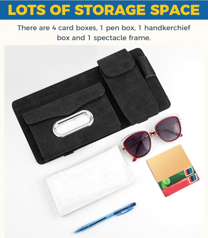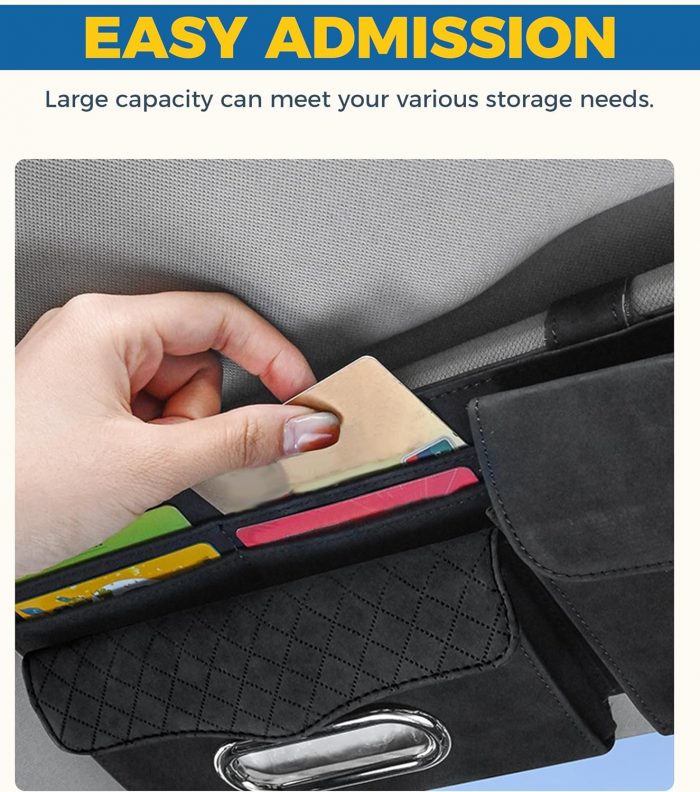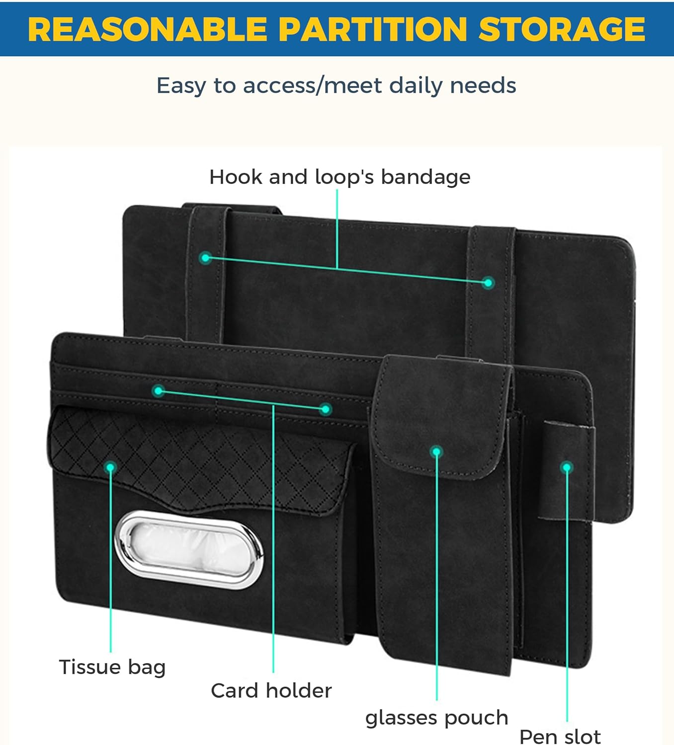 [Large Storage Capacity] Car Sun Visor Storage Box Equipped with 4 card slots, 1 tissue bag, 1 sunglasses bag and 1 pen bag, it can meet your different storage needs and keep your car tidy.