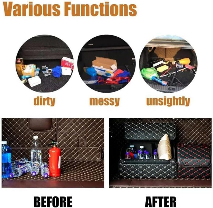 Material: El organizador de maletero de coche está fabricado con materiales de alta calidad y puede soportar el peso de objetos pesados. Además, nuestro organizador de maletero de coche tiene una base antideslizante para evitar que se deslice. Ya sea un camión grande, un todoterreno o un sedán, esta bolsa de almacenamiento de maletero es adecuada para maleteros de todos los tamaños