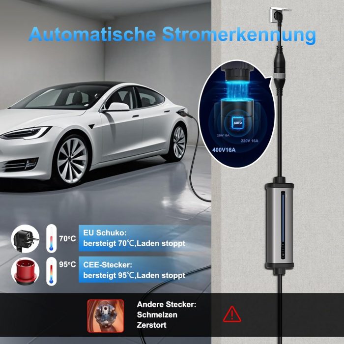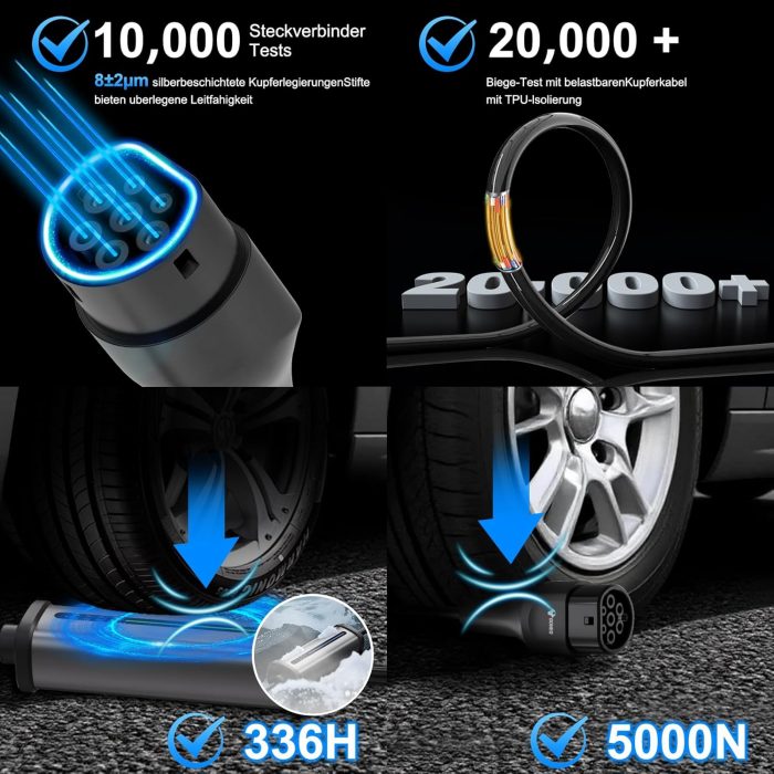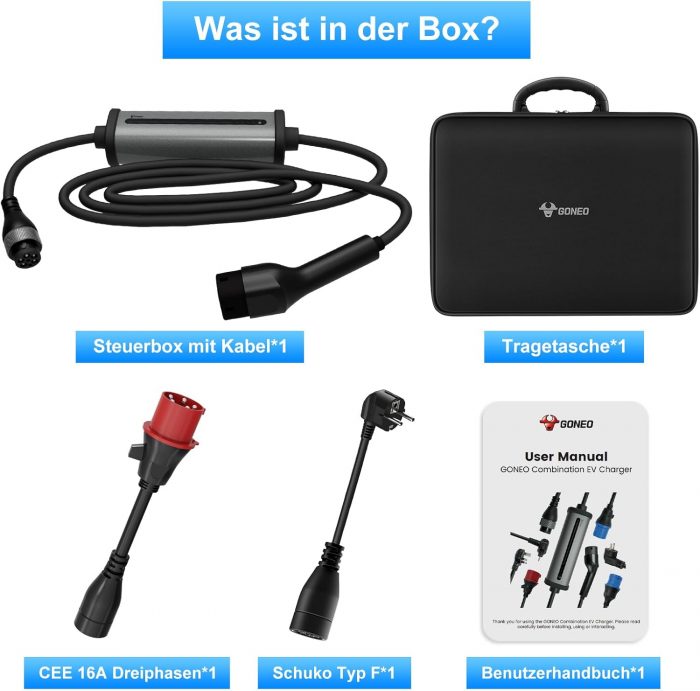 PLUG & PLAY ELECTRIC VEHICLE CHARGER – The GONEO 11kW mobile wall box is equipped with a European 3.68kW 2-pin Schuko plug and a 11kW CEE plug (red). Simply plug it into an existing CEE outlet or household outlet, and your vehicle will charge at full power. The charger automatically detects the power requirements of the connector type and prevents overcharging or mismatch. The 7m long EV Charger Type 2 cable offers enough range. 11 kW mobile wallbox ideal as a stationary charging station for home or office, as well as a mobile charger for travel. 7m charging cable without installation. High Quality TPU Cable Technology The EV charger is made of tough TPU material (-40℃ to +125℃) with corrosion-resistant aluminum housing (-40℃ to 85℃). Ultrasonic welded connectors withstand 10,000 connection cycles. The whole charger with sockets can withstand pressure up to 2 tons. EV charging station IP66 encapsulated control box and IP55 connectors offer protection against water and dust. 11 kW three-phase power charger Aluminum locking ring on the connectors for a secure grip, perfect for continuous outdoor use. 8-16A Adjustable Current Charging Station & Intelligent Time Control: LED indicator displays charging status. Choose from 8A/10A/13A/16A for fast or smooth charging. Mobile charging station with the timer function (2/4/6/8 hours) take advantage of cheap energy at night and reduce your costs. Reminder function stores your preferred amperage for convenient charging. Box contents: control box with cable, three-phase EEC plug 11 kW (red), Schuko plug 3.68 kW, instruction manual (English language not guaranteed), carry bag. Each connector has a dust cap for durability. Wide Compatibility Type 2 electric car charger compatible with all electric and hybrid vehicles with type 2 connector (IEC 62196-2) or CCS2, such as ID.3/4/5, e-Golf, e-Up, 500, Model Y/3, Spring, Kona, Ioniq 5, GLA, e-tron, ZOE, i3/i4, etc. BEV/PHE. V according to IEC 62196-2. MULTIPLE CERTIFIED & SAFETY TESTED – The GONEO 11 kW electric car charger has numerous safety certifications. Intelligent control offers 9 protections including over-current, overheating and residual current protection. Built-in RCD Type A (30mA AC) with additional DC protection (6mA) ensures maximum safety for vehicle and charging equipment. In case of exceeding 70°C (household plug) or 95°C (industrial plug), the charger activates the NTC temperature protection. 11 kW box, ev portable charger, portable charging station, 11 kW mobile wall box, mobile wall box with Schuko adapter, mobile charging station, charging station for car e 11 kw, electric charging station car, charging cable E Auto Typ 2,ladekabel 11kw Typ 2,ladegerät Typ 2,ladegerät e auto,goneo Typ 2 Charging Cable El,Ev Ladestation,Ev Ladegerätev Charger 11KW,EV Car Charger,Electric Vehicle Charger,11KW Ladegerät Mobil,11KW 3-Phasig11 KW Mobile Charger,11kW Ladekabel Typ 2 With EEC Plug. GONEO Mobile Wallbox 11kW Universal Charging Station for Electric and Hybrid Vehicles