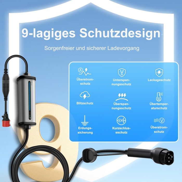 Maximum safety with TÜV certification: the GONEO 11 kW mobile charging station offers 9 protection functions (over-current, over-voltage, under voltage, over temperature, leakage, ground, lightning, short circuit, overvoltage) – protect your home and vehicle 100%. Complete certifications: TÜV-CE, CB, RoHS, REACH, IP66 (waterproof) and IK10 (shock resistant), meets the highest German safety standards