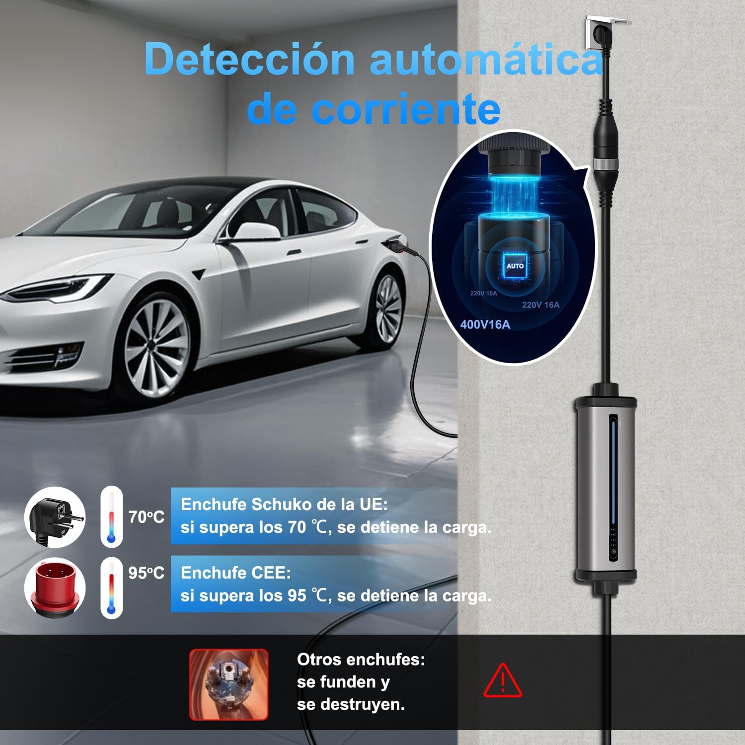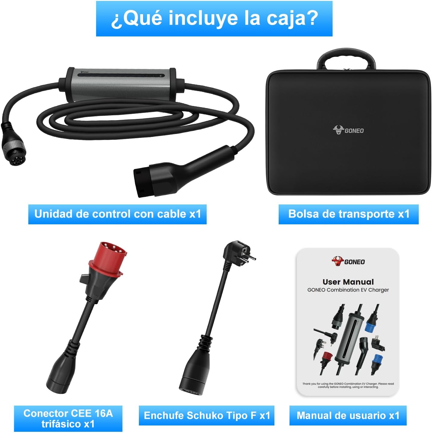 CARGADOR DE VEHÍCULO ELÉCTRICO PLUG & PLAY – La caja de pared móvil GONEO de 11kW está equipada con un enchufe Schuko europeo de 2 pines de 3,68kW y un enchufe CEE de 11kW (rojo). Simplemente conéctelo a una toma CEE existente o a una toma doméstica y su vehículo se cargará a plena potencia. El cargador detecta automáticamente los requisitos de energía del tipo de conector y evita la sobrecarga o la falta de coincidencia. El cable del cargador EV tipo 2 de 7 m de largo ofrece suficiente alcance. Wallbox móvil de 11 kW ideal como estación de carga estacionaria para el hogar o la oficina, así como cargador de móvil para viajes. Cable de carga de 7m sin instalación. Tecnología de cable TPU de alta calidad El cargador EV está hecho de material TPU resistente (-40 ℃ a +125 ℃) con carcasa de aluminio resistente a la corrosión (-40 ℃ a 85 ℃). Los conectores soldados por ultrasonidos soportan 10.000 ciclos de conexión. Todo el cargador con enchufes puede soportar una presión de hasta 2 toneladas. Estación de carga para vehículos eléctricos, caja de control encapsulada IP66 y conectores IP55 que ofrecen protección contra el agua y el polvo. Cargador de corriente trifásico de 11 kW. Anillo de bloqueo de aluminio en los conectores para un agarre seguro, perfecto para uso continuo en exteriores. Estación de carga de corriente ajustable de 8-16 A y control de tiempo inteligente: el indicador LED muestra el estado de carga. Elija entre 8A/10A/13A/16A para una carga rápida o fluida. La estación de carga móvil con función de temporizador (2/4/6/8 horas) aprovecha la energía barata por la noche y reduce tus costes. La función de recordatorio almacena su amperaje preferido para una carga conveniente. Contenido del envío: caja de control con cable, enchufe CEE trifásico de 11 kW (rojo), enchufe Schuko de 3,68 kW, manual de instrucciones (idioma español no garantizado), bolsa de transporte. Cada conector tiene una tapa antipolvo para mayor durabilidad. Amplia compatibilidad Cargador de coche eléctrico tipo 2 compatible con todos los vehículos eléctricos e híbridos con conector tipo 2 (IEC 62196-2) o CCS2, como ID.3/4/5, e-Golf, e-Up, 500, Model Y/3, Spring, Kona, Ioniq 5, GLA, e-tron, ZOE, i3/i4, etc. BEV/PHE. V según IEC 62196-2. MÚLTIPLES CERTIFICADOS Y PROBADOS DE SEGURIDAD: el cargador para automóvil eléctrico GONEO de 11 kW tiene numerosas certificaciones de seguridad. El control inteligente ofrece 9 protecciones que incluyen protección contra sobrecorriente, sobrecalentamiento y corriente residual. El RCD tipo A incorporado (30 mA CA) con protección CC adicional (6 mA) garantiza la máxima seguridad para el vehículo y el equipo de carga. En caso de superar los 70°C (enchufe doméstico) o 95°C (enchufe industrial), el cargador activa la protección de temperatura NTC. Caja de 11 kW, cargador portátil EV, estación de carga portátil, caja de pared móvil de 11 kW, caja de pared móvil con adaptador Schuko, estación de carga móvil, estación de carga para coche e 11 kw, estación de carga eléctrica para coche, cable de carga E Auto Typ 2,ladekabel 11kw Typ 2,ladegerät Typ 2,ladegerät e auto,goneo Typ 2 Charging Cable El,Ev Ladestation,Ev Ladegerätev Charger 11KW, cargador de coche EV, cargador de vehículo eléctrico, cargador móvil de 11KW, trifásico de 11KWCargador móvil de 11 KW, cable de carga tipo 2 de 11kW con enchufe EEC. Estación de carga universal GONEO Mobile Wallbox de 11 kW para vehículos eléctricos e híbridos