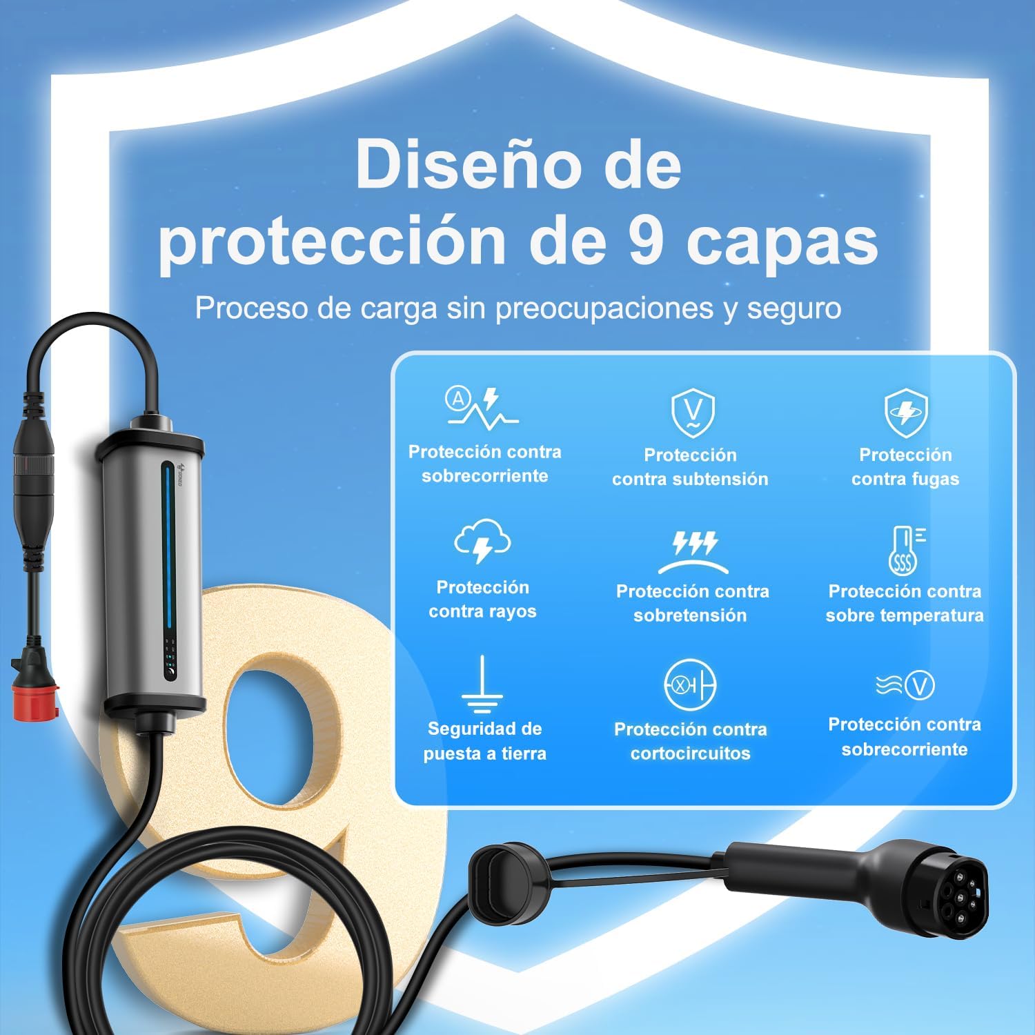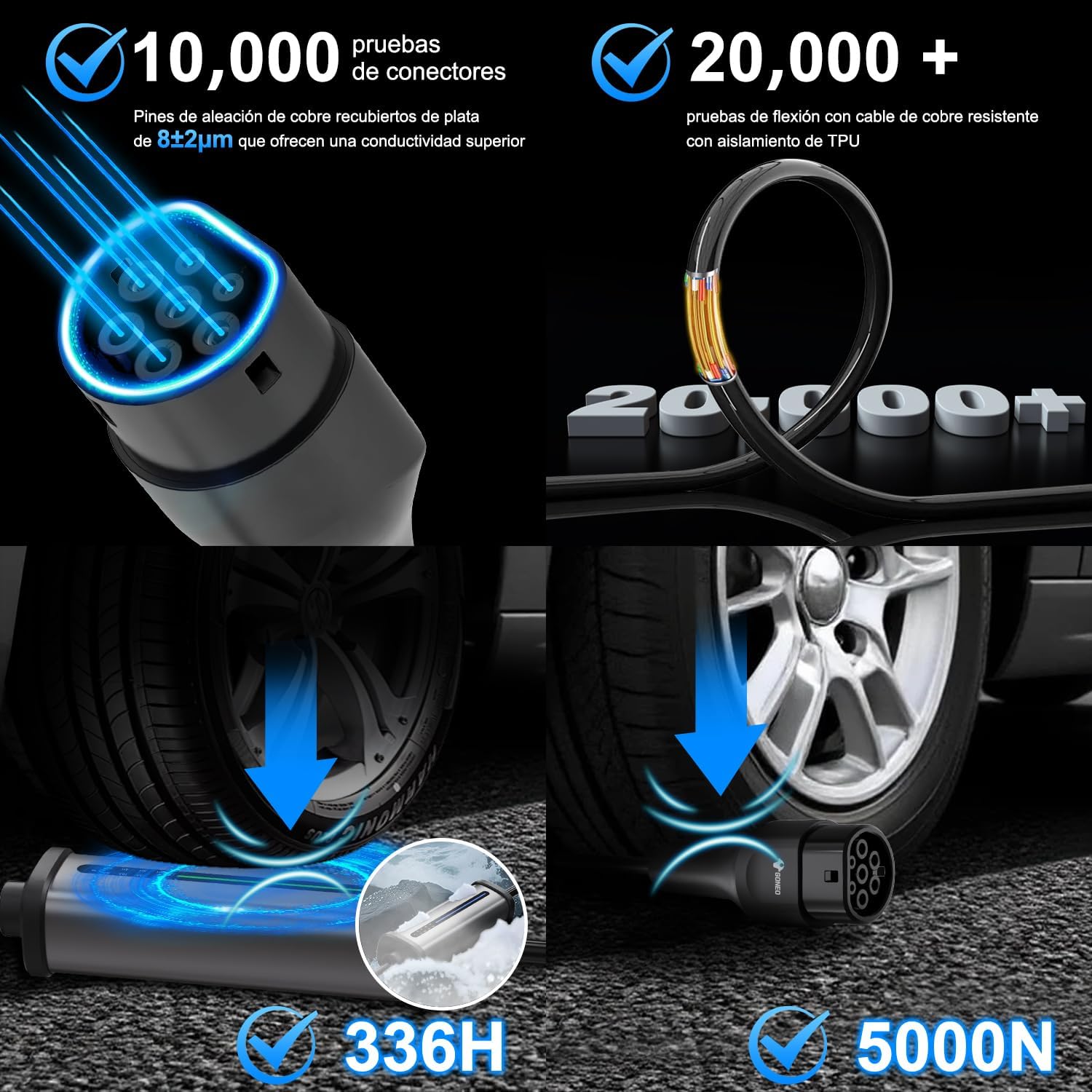 Máxima seguridad con certificación TÜV: la estación de carga móvil GONEO de 11 kW ofrece 9 funciones de protección (sobrecorriente, sobretensión, subtensión, sobretemperatura, fuga, tierra, rayo, cortocircuito, sobretensión): protege tu hogar y tu vehículo al 100%. Certificaciones completas: TÜV-CE, CB, RoHS, REACH, IP66 (impermeable) e IK10 (resistente a golpes), cumple con los más altos estándares de seguridad alemanes.