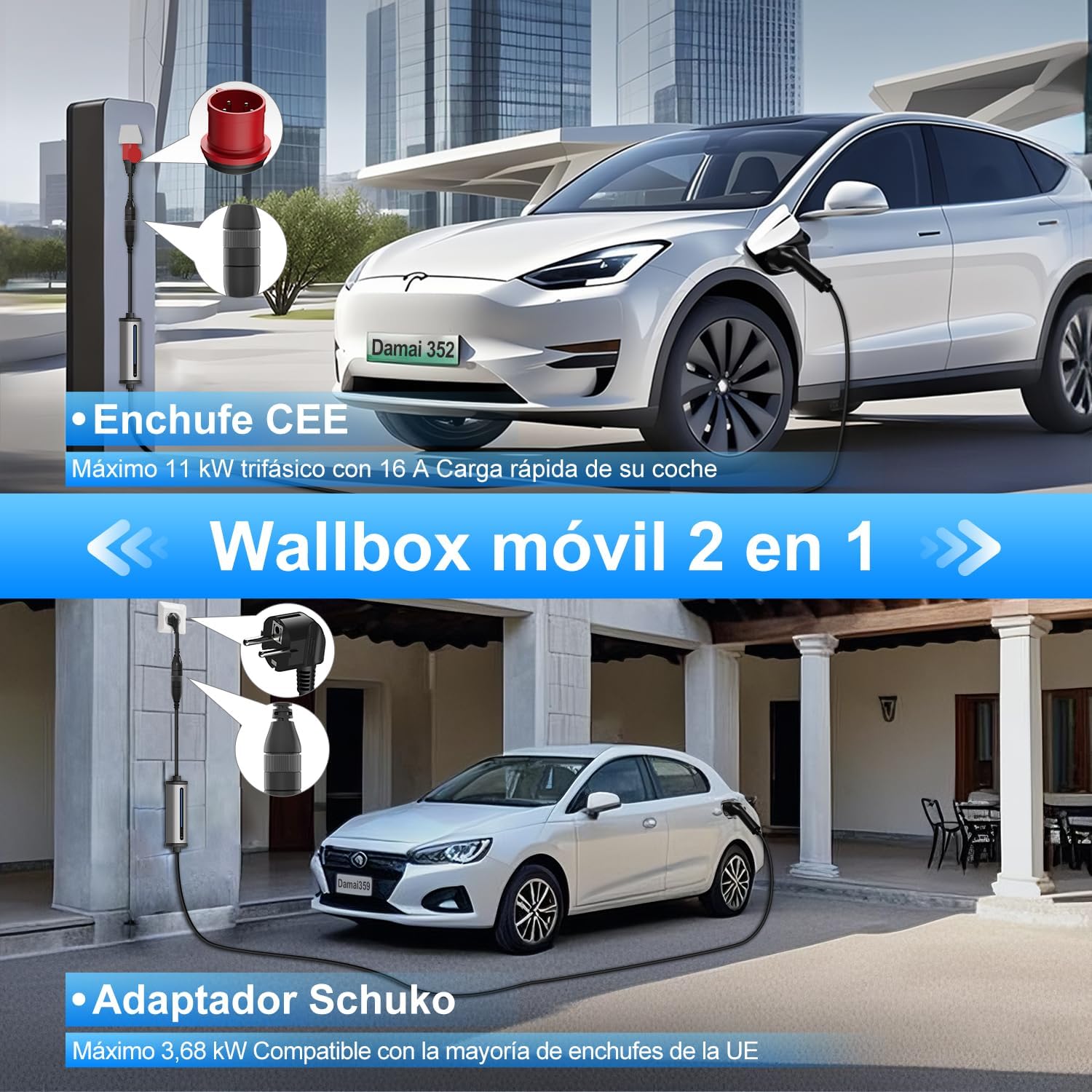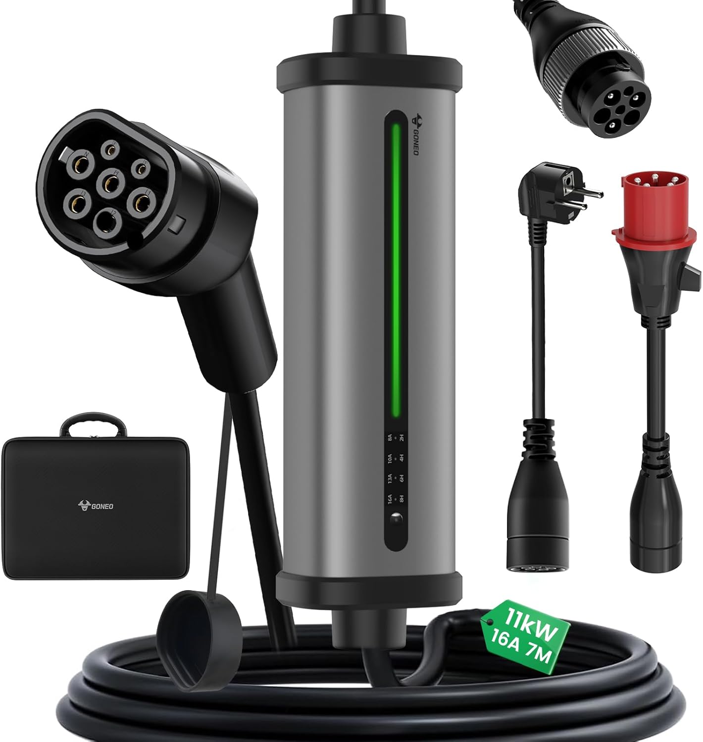 GONEO Wallbox/Estación de Carga Móvil 11 kW Cable de Carga CEE 16 A a Tipo 2 (7 M|3 Fases | 8-16 A Ajustable) con Temporizador 2-8H Cargador EV para Modelo Y/3 ID.3 y Otros EV, Incluye Enchufe