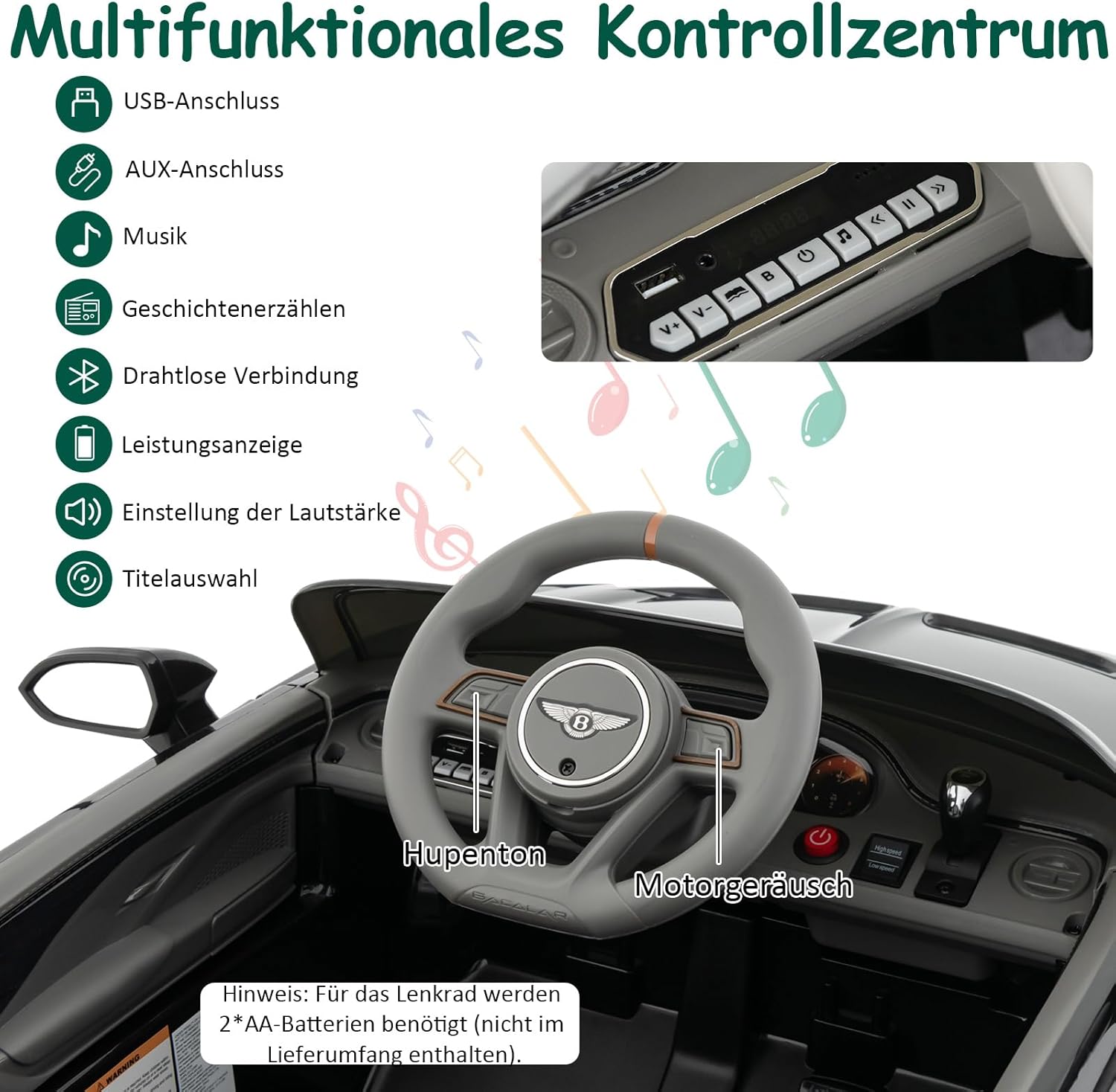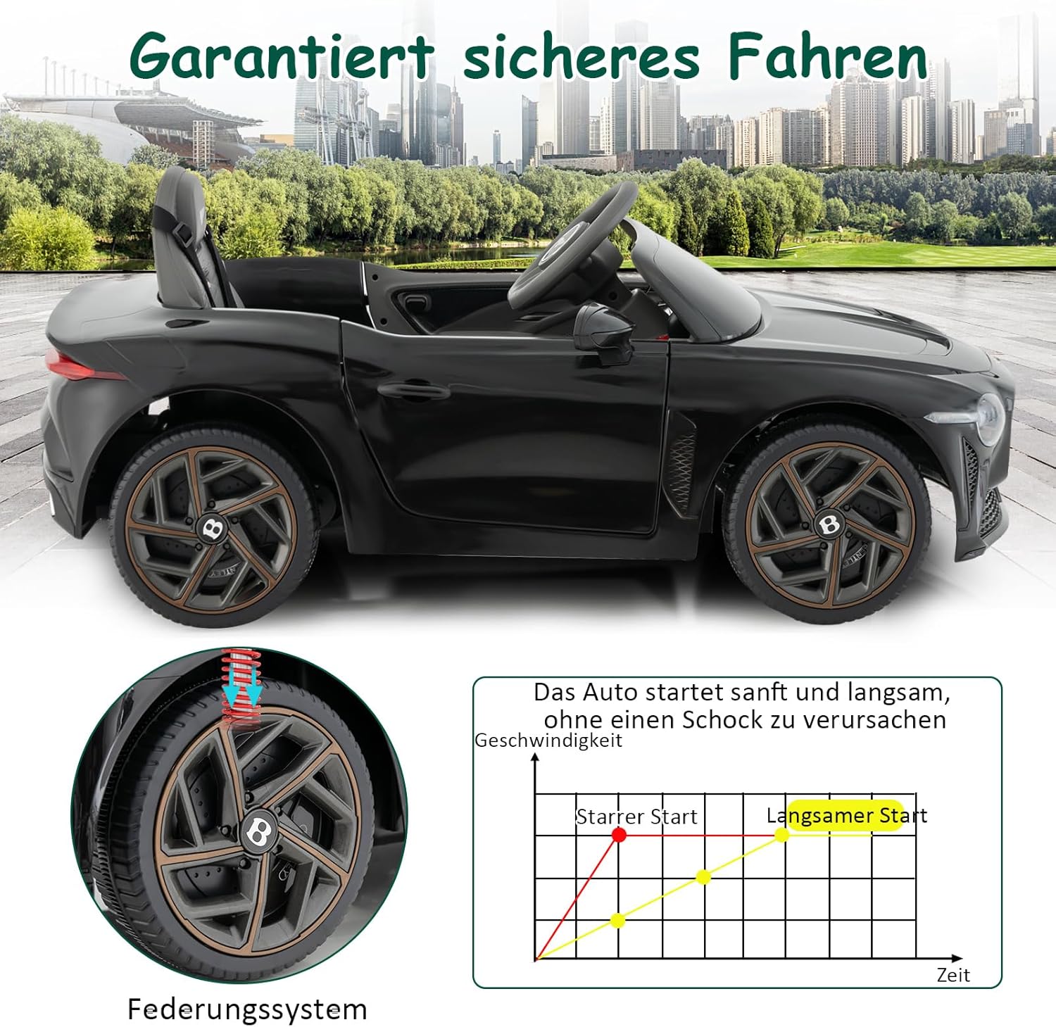 Si está buscando un automóvil eléctrico para niños único y absolutamente genial que deleite a su hijo, entonces este automóvil eléctrico Bentley es perfecto para usted. Cuenta con faros delanteros, luces traseras, espejos retrovisores, puertas con cerradura, etc., y parece un Bentley real. Además, el centro multimedia multifuncional con música y sonidos hace que el viaje sea aún más divertido. El coche eléctrico se maneja sin esfuerzo, por lo que los niños pueden tomar el control ellos mismos o los padres tienen la posibilidad de utilizar la función de control remoto. Con potentes motores y baterías, el vehículo eléctrico ofrece una larga vida útil. La seguridad es nuestra máxima prioridad, como lo demuestra el sistema de arranque suave, el cinturón de seguridad de 3 puntos, las puertas con cerradura y las ruedas con amortiguación.