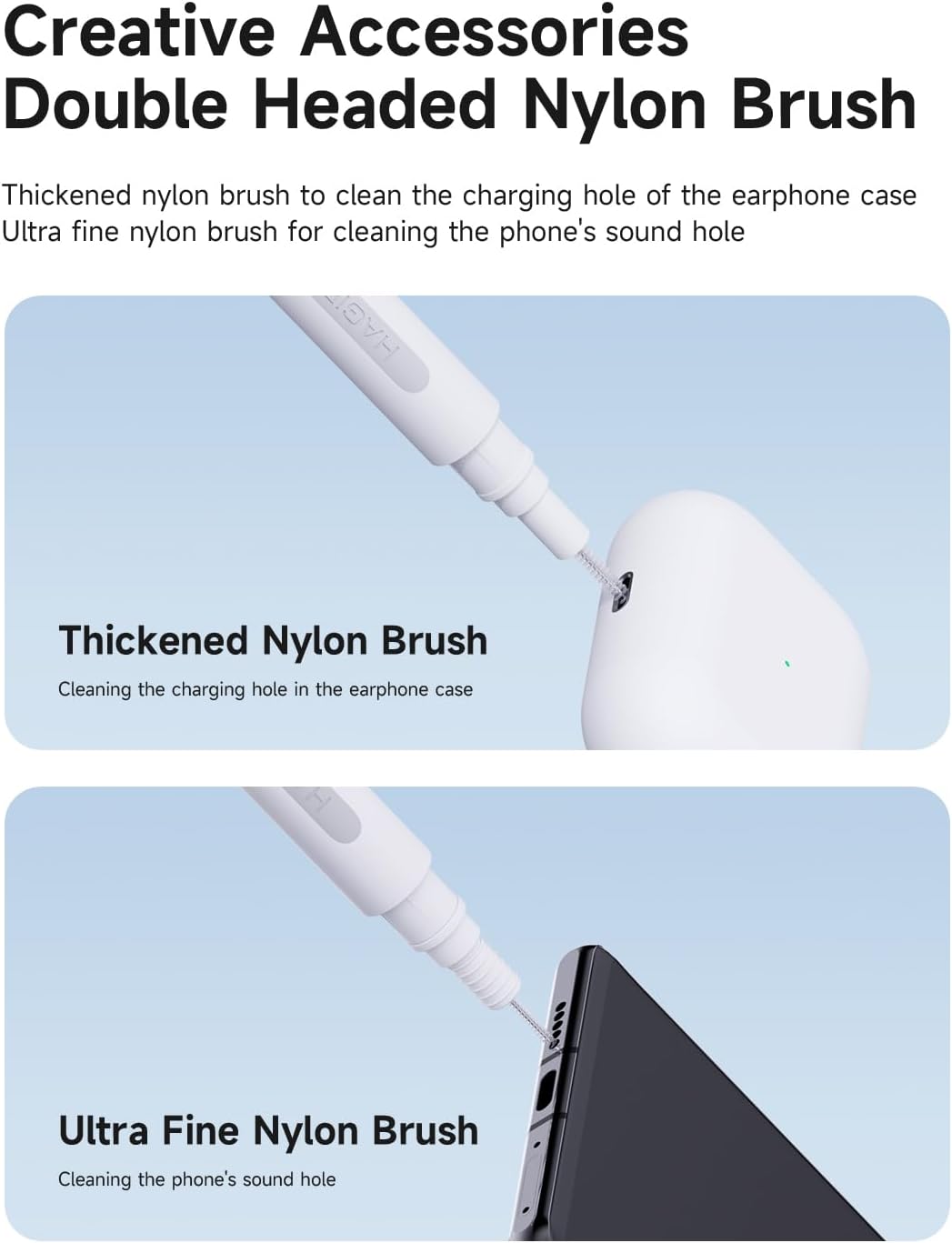 【Diseño de cabezal doble separado】Kit de limpieza de auriculares Hagibis 3 en 1 con esponja aterciopelada, cepillo de alta densidad y punta de bolígrafo de metal; Diseño de doble cabezal oculto para satisfacer diferentes necesidades de limpieza.
