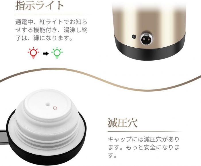 The red indicator is on when heated, green for thermal insulation mode. When the water reaches 100, it will automatically shut off