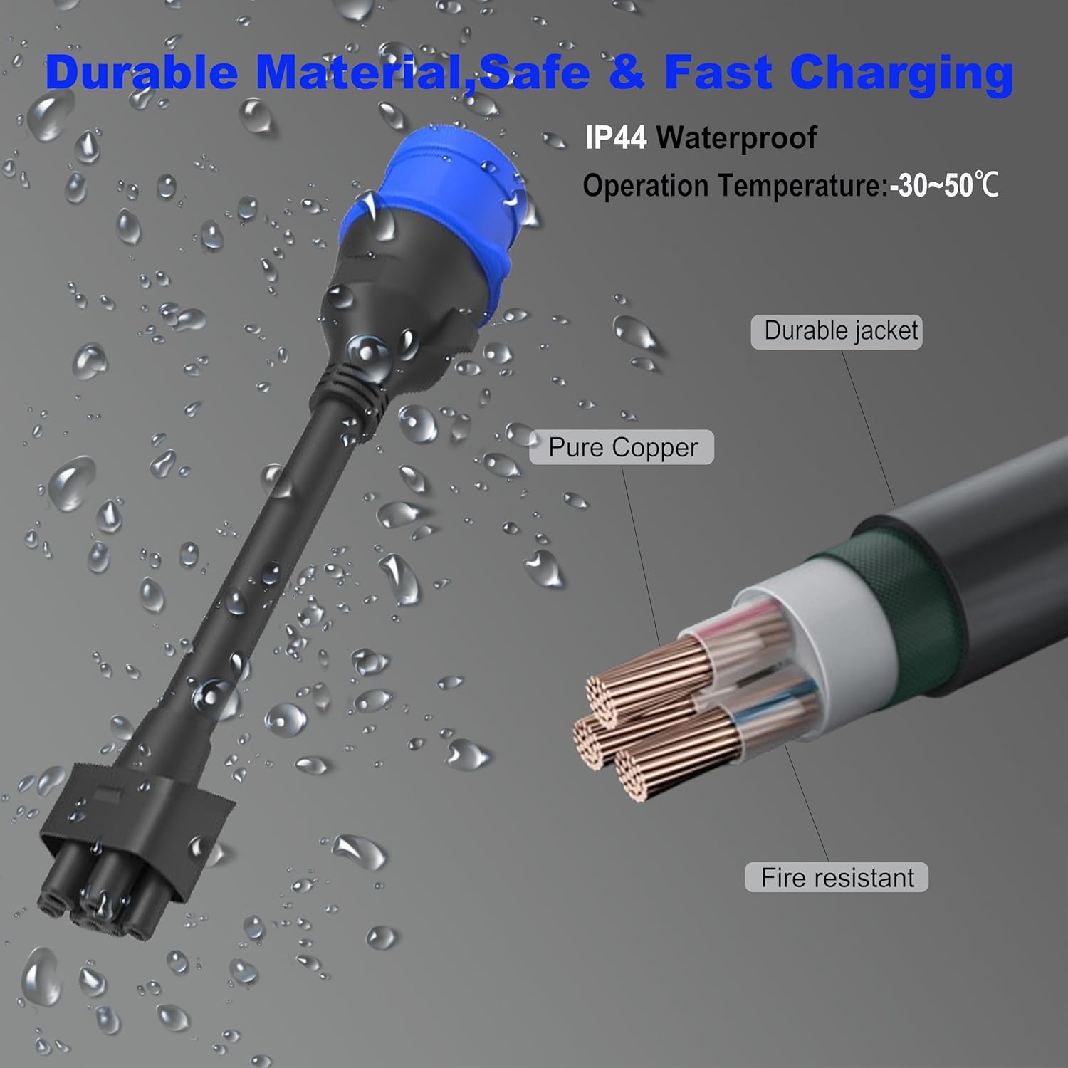 ✅The protection rating is IP 44. The charging cable for VE can work under conditions ranging from -30℃ to 50℃. The shell is thermoplastic material (UL94V-0 flame retardant quality).